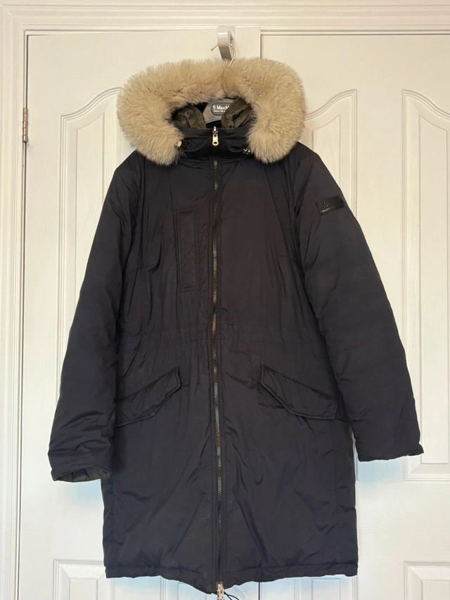 Stay ultra-warm and stylish this winter with this authentic Peuterey double-sided down jacket. Crafted with premium white duck down (90%) and feather (10%), it delivers exceptional warmth while remaining lightweight and breathable. Double-sided design — two looks in one, Removable real fur trim on hood, Attached hood for maximum warmth, Water- and wind-resistant nylon shell Like new condition, gently worn, no flaws. This jacket combines timeless design with technical performance — perfect for cold Canadian winters or après-ski getaways. Size eur 46 US L