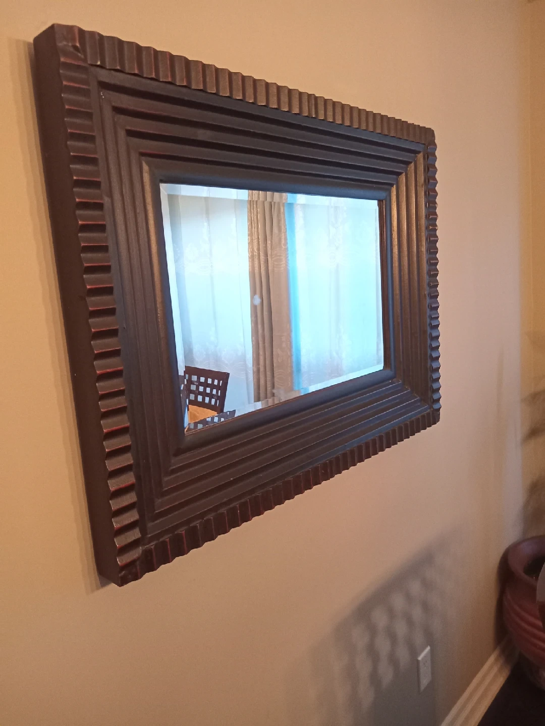 15A decorative framed wall mirror, perfect for adding a touch of elegance to any room. The frame features a unique design, and the mirror is in great shape!