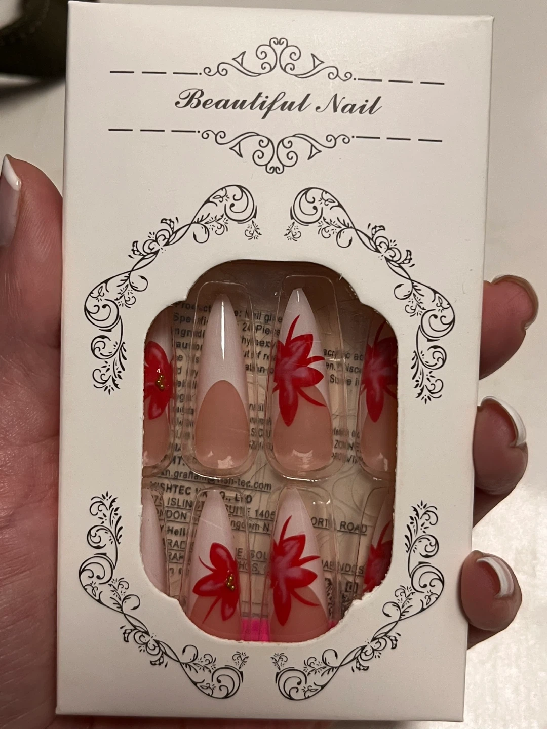 Selling a set of press-on nails with a cute floral design! These are brand new in the box and ready to add a touch of elegance to your look. Perfect for a quick and easy manicure at home
