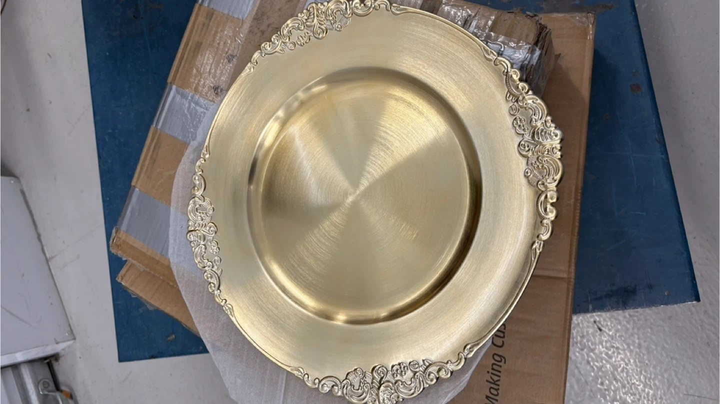 Selling a gold charger plate. It's in great condition and would be perfect for adding a touch of elegance to your dining table or special event