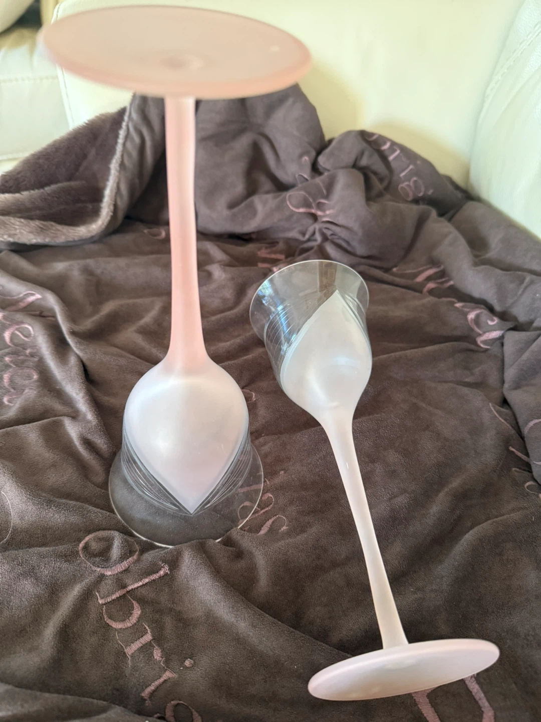 Selling a set of two elegant stemmed glasses with frosted pink part.They have a unique design with a clear top and a frosted pink stem and base. These would be a lovely addition to any table setting or home decor