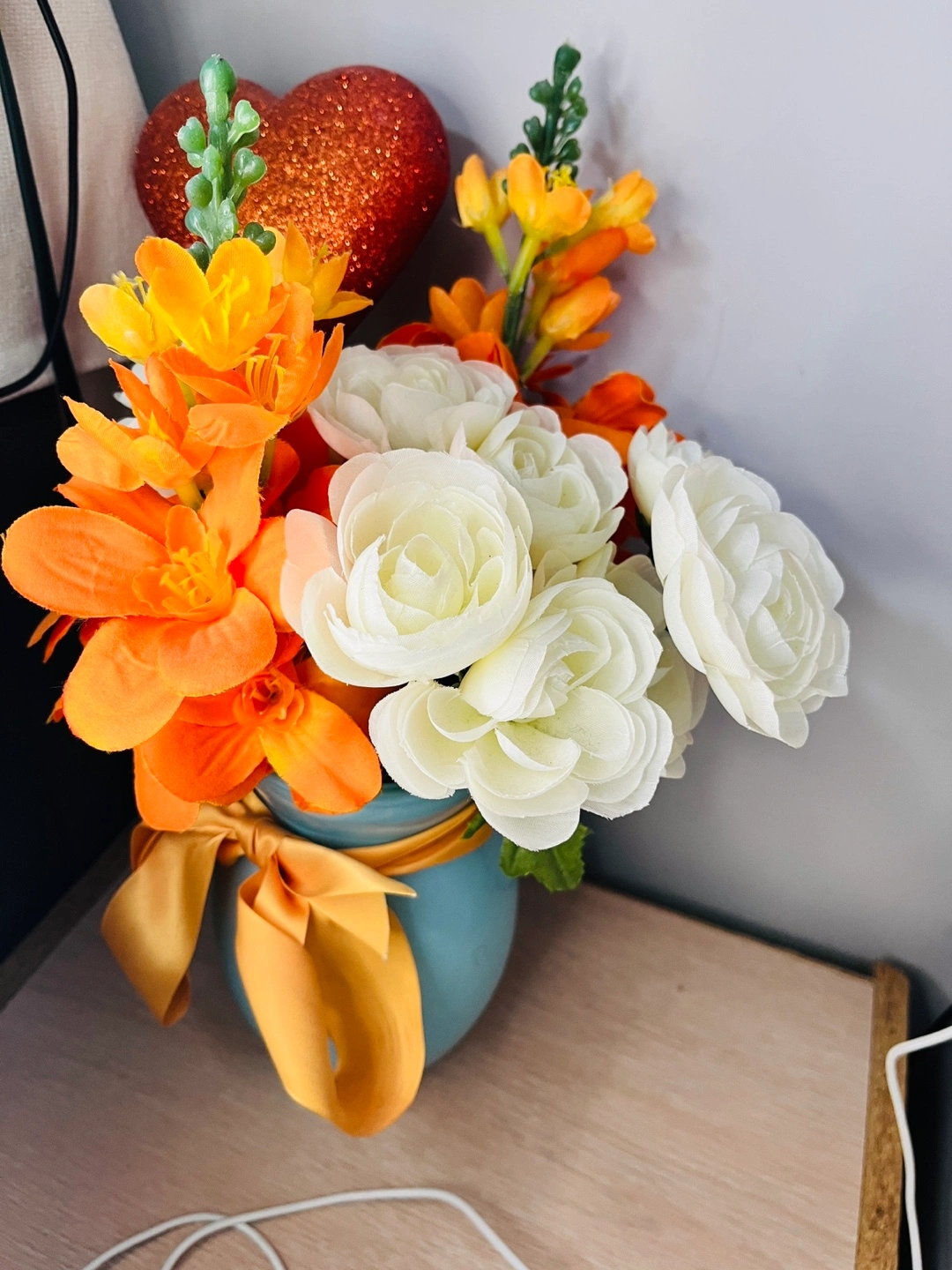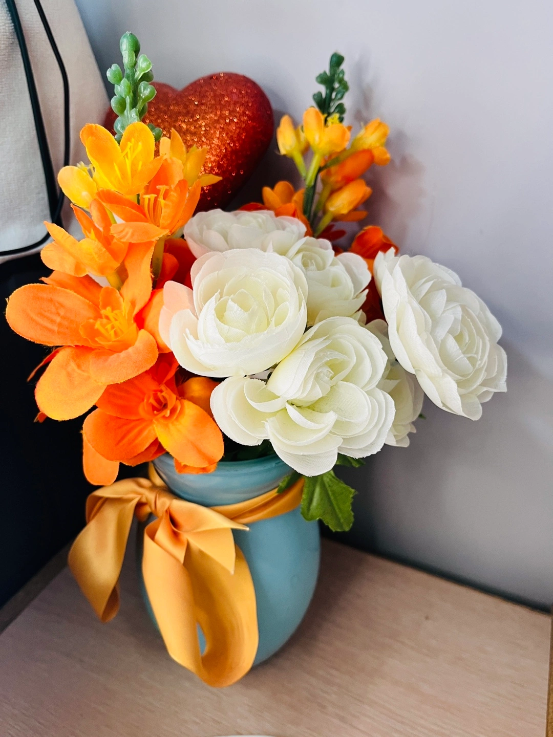 20A lovely artificial flower arrangement featuring white roses and orange lilies in a blue vase. It's tied with a pretty orange ribbon and includes a decorative heart. Perfect for adding a touch of colour to any room! Its a pretty decorative piece i added flowers on my own.