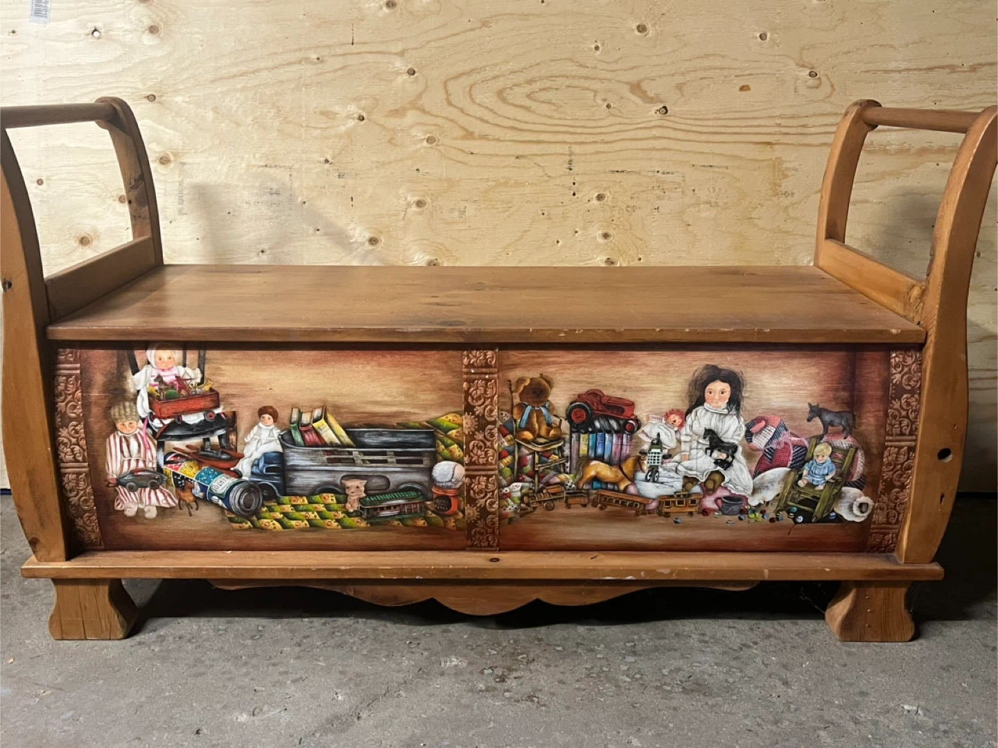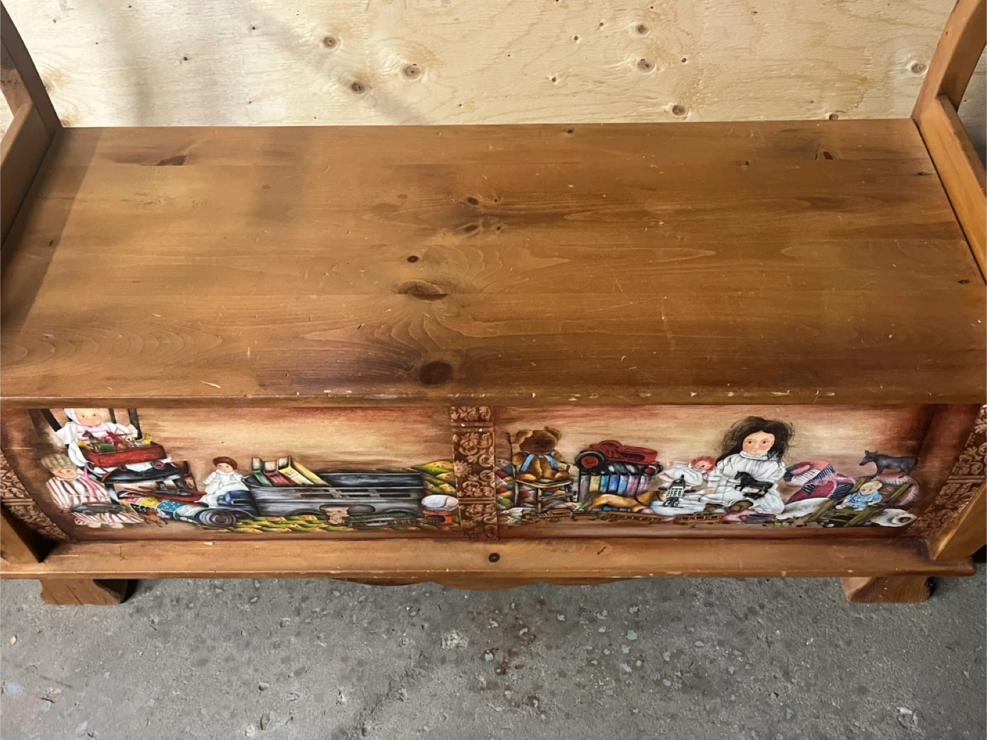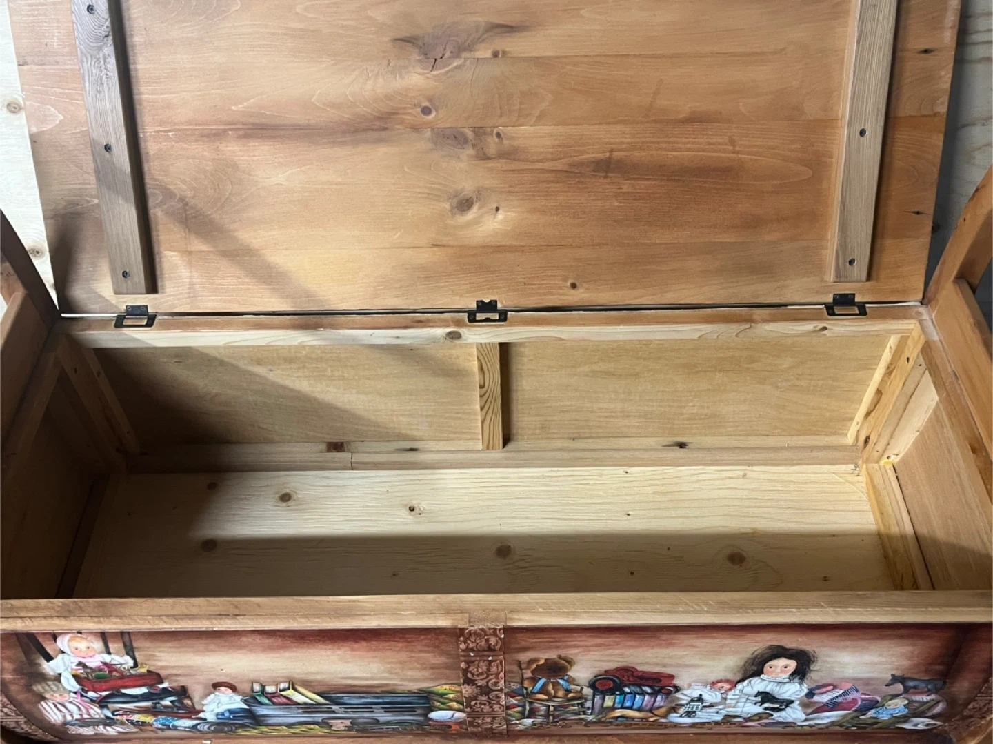 Selling a lovely wooden toy chest! It features a charming hand-painted design, perfect for adding a touch of whimsy to any room. It's great for storing toys, blankets, or other treasures. Make an offer!