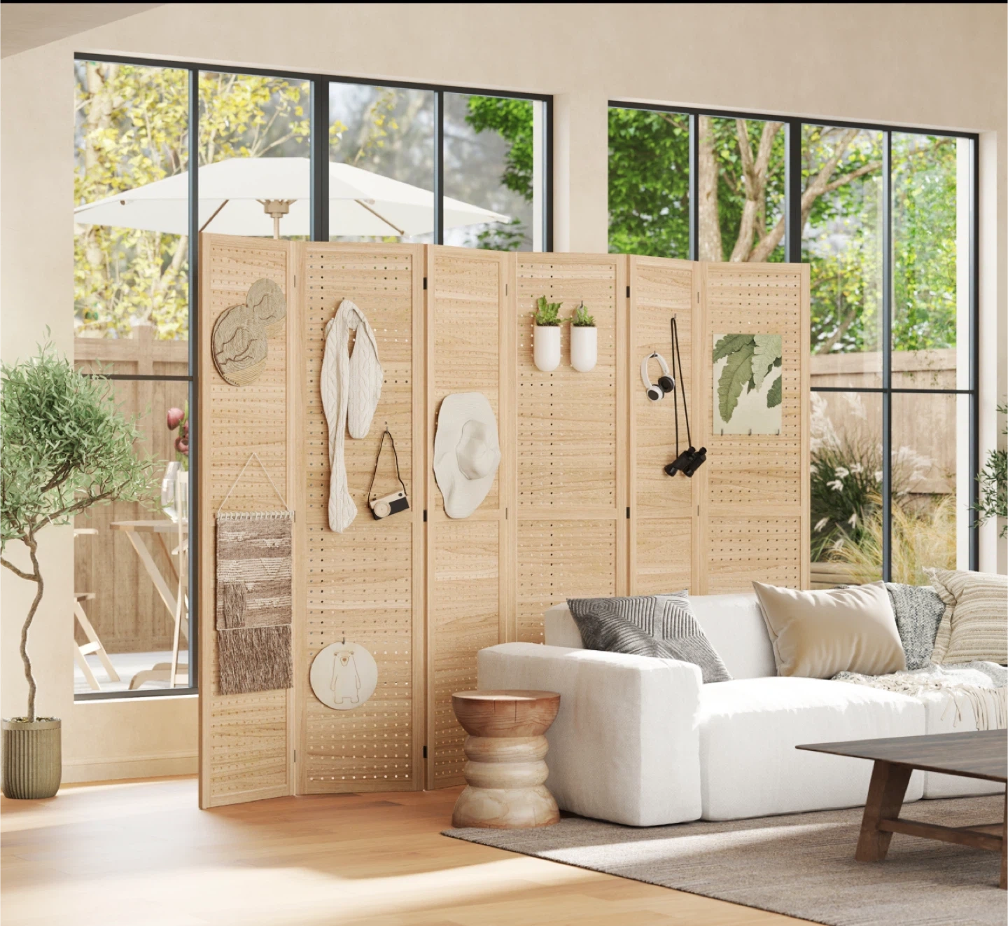 This wooden room divider is perfect for adding a touch of modern style to your home. It features 500 small round holes for many types of peg hooks, so you can customize it to fit your needs. The solid wood frame and sturdy metal hinges ensure that it will last for years to come
