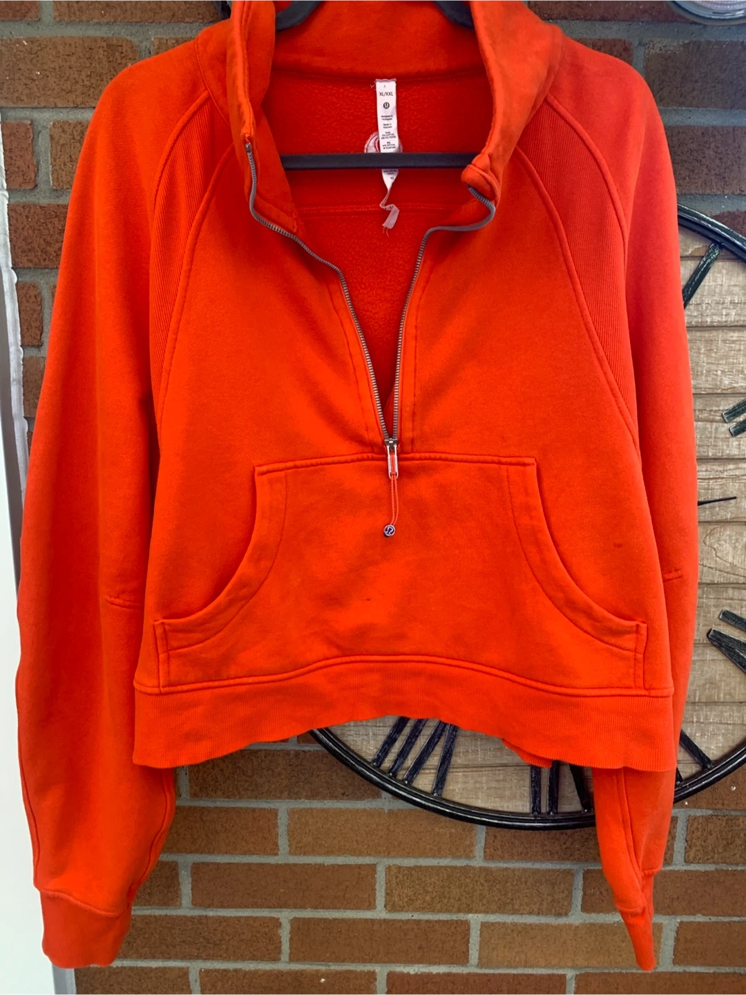 697Selling a gently used Lululemon Scuba half-zip pullover in a vibrant orange colour! It's in great condition with just one tiny mark on the kangaroo pouch and is an over-sized XL/XXL. It features a cropped style that sits at natural waist, thumb holes in sleeves, zip pull front, kangaroo pouch with hidden mesh phone sleeve and a soft 70% cotton and 30% poly material. It regularly sells for $118. Perfect for layering or wearing on its own to keep you cozy this season! Cash only please. Hanger not included.