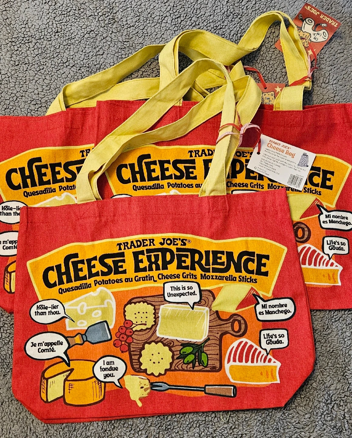 131I'm selling a Trader Joe's Cheese Experience tote bag! It's a fun and sturdy bag perfect for groceries or everyday use. The bag features a colourful design with various cheese-related graphics and sayings. It's made of heavy-duty cotton, so it's sure to last