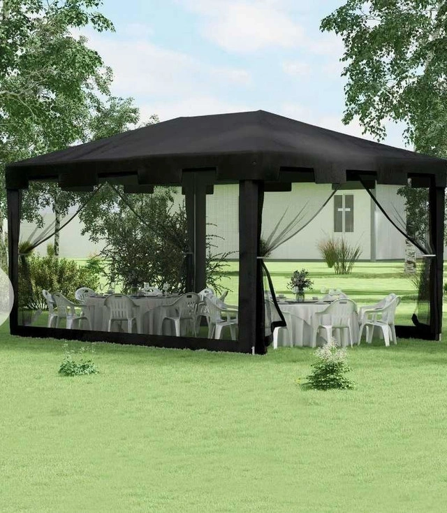This 10 x 13 ft gazebo features a durable powder-coated steel frame for strength and rust resistance. The PE fabric canopy is weather-resistant and blocks harmful UV rays. Removable zippered sides allow for airflow and natural light. Ideal for parties and BBQs, it includes 4 ropes and 8 stakes for stability. The overall dimensions are 9.7 ft x 13 ft, with an eave height of 6.6 ft and a top height of 8.5 ft. Assembly requires 2-3 people for setup. Overall Dimensions: 13'L x 9.7'W x 8.4'H Item Weight: 29 lbs. Brand new, factory packaging.