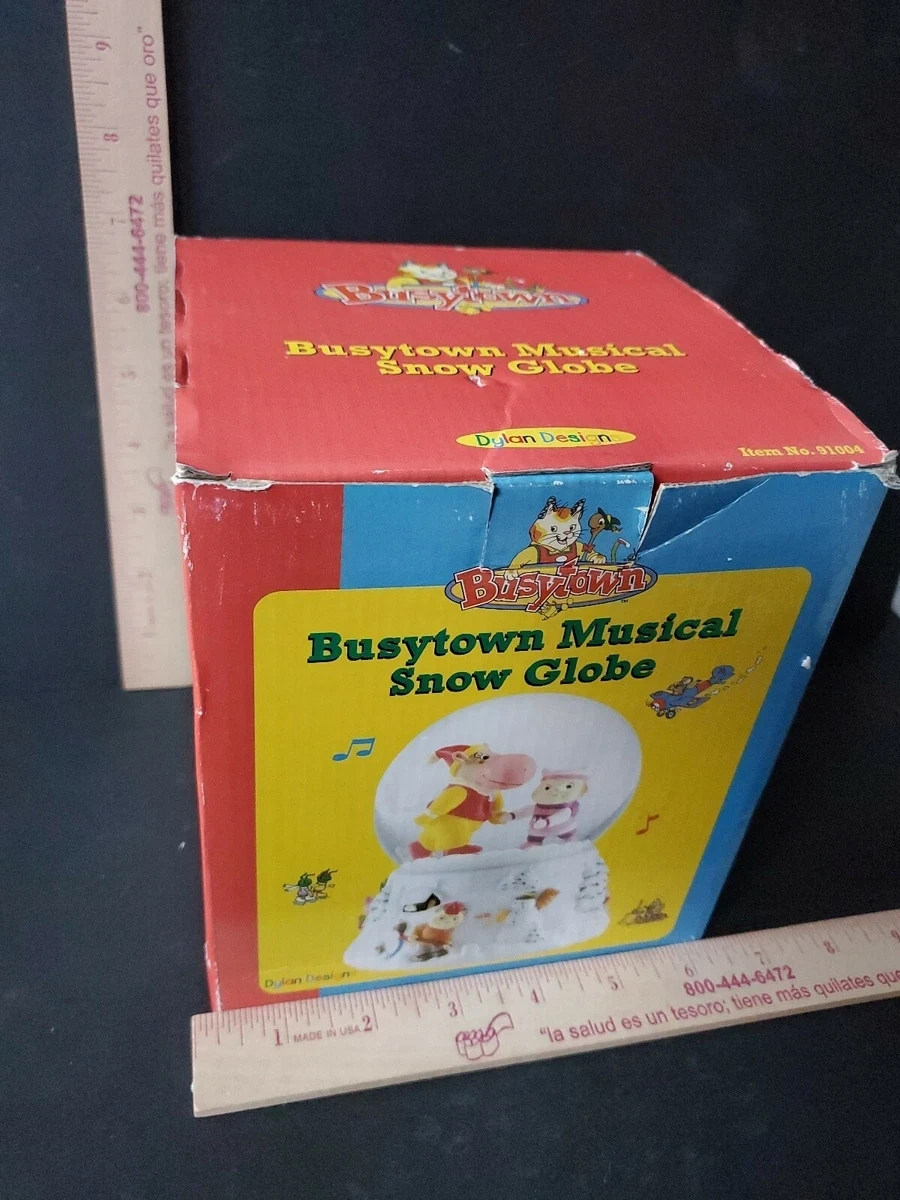 Selling a 1999 new Busytown Musical Snow Globe in its original box! This charming snow globe features characters from Busytown in a winter scene. Plays the tune "We Wish You a Merry Christmas". It's a delightful piece for any collector or as a festive decoration for the holidays