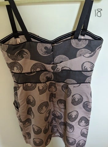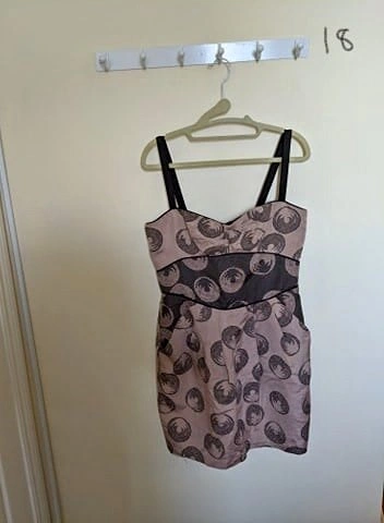 BCBG strappy light pink and black cocktail dress with button detail in the back, and pockets. Size 10. ($30)