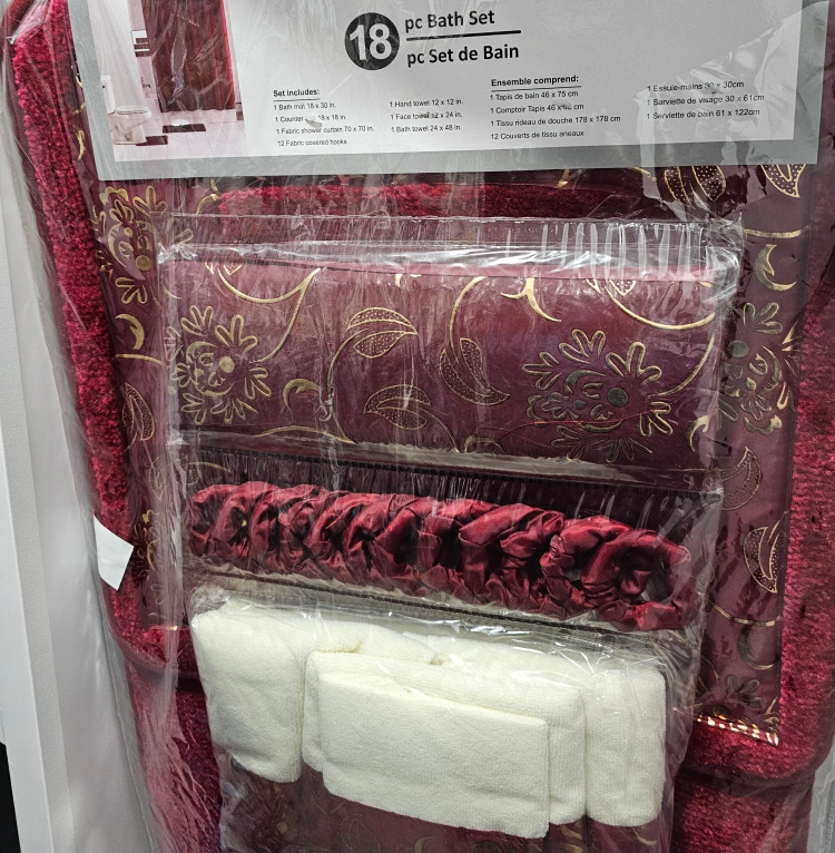 Brand new 18-piece bath set, still in its original packaging! This set includes everything you need to refresh your bathroom: a bath mat (18 x 30 inches), a contour mat (18 x 18 inches), a fabric shower curtain (70 x 70 inches), 12 fabric-covered hooks, a hand towel (12 x 12 inches), a face towel (12 x 24 inches), and a bath towel (24 x 48 inches)