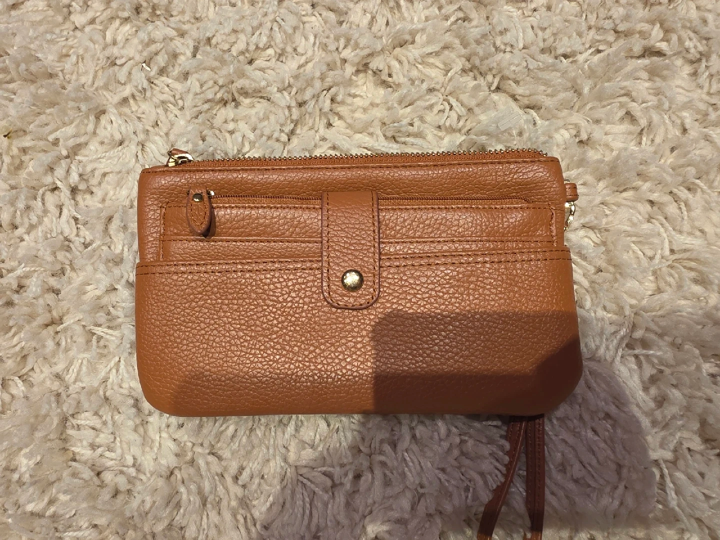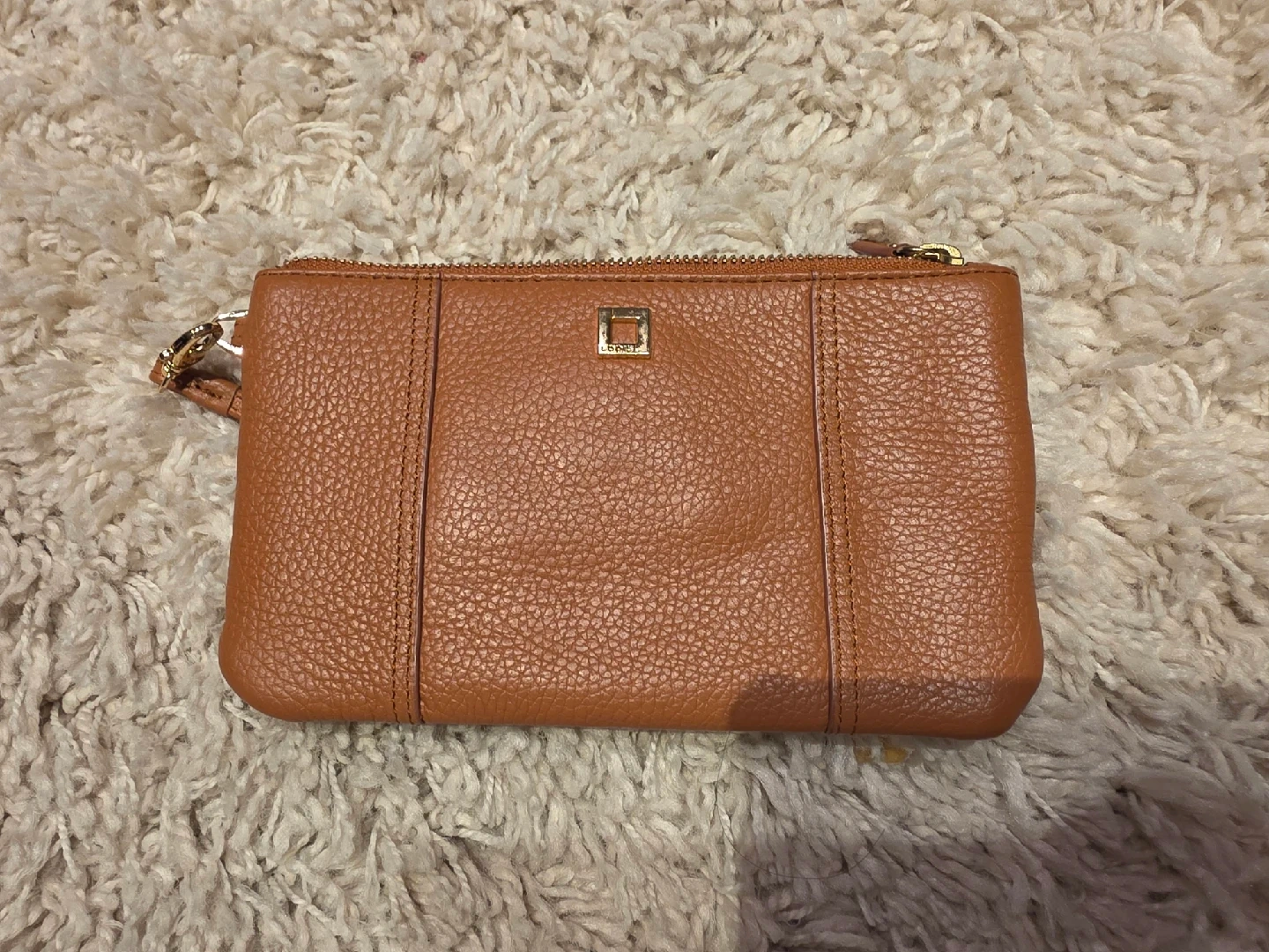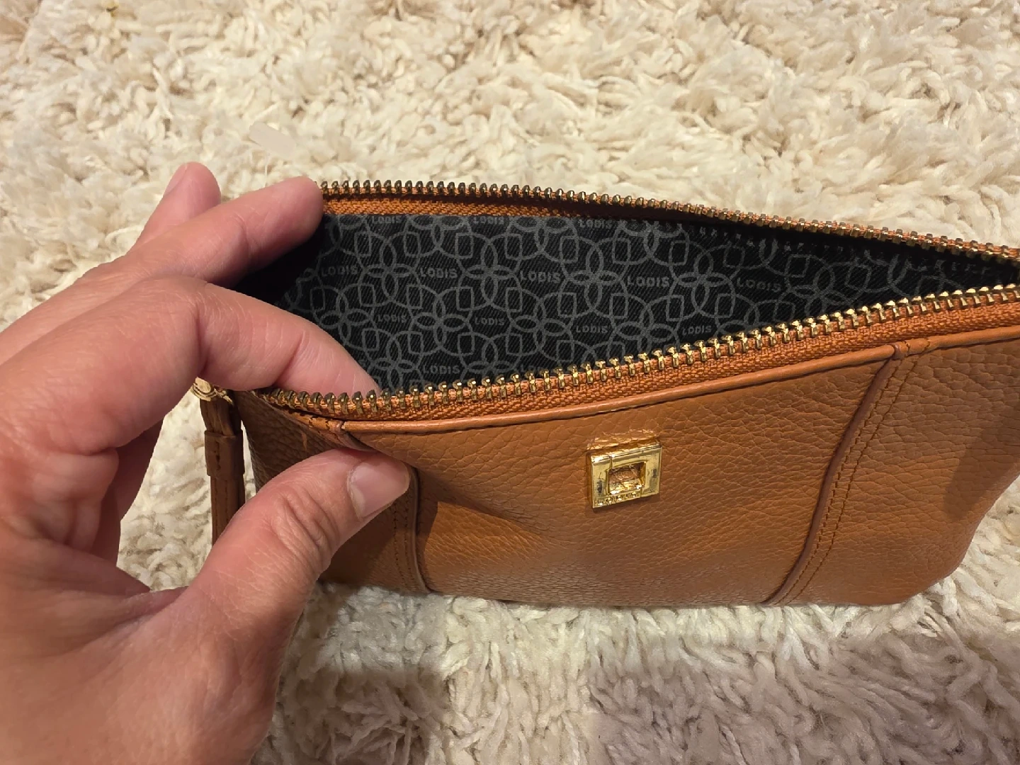 66A stylish Lodis wallet in a beautiful brown leather. It has a zippered compartment and a snap closure section for easy organization. The interior features a patterned lining. Perfect for keeping your essentials secure and looking good!