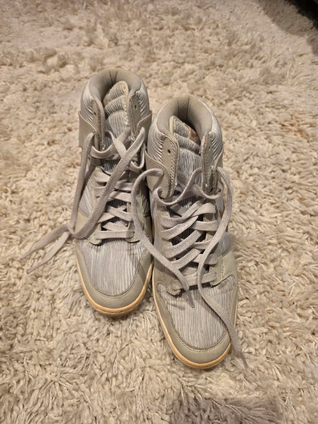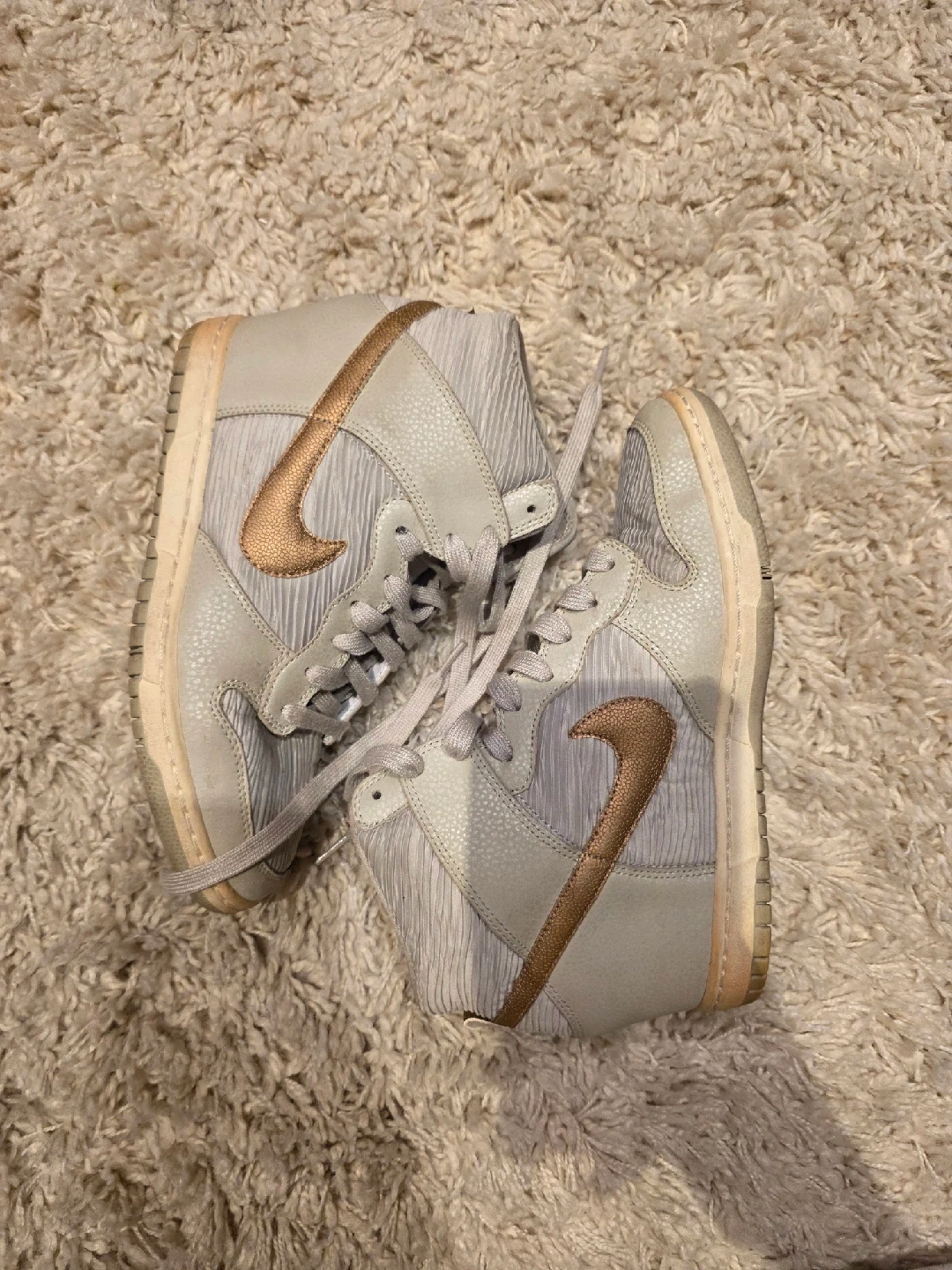 66Selling a pair of Nike Dunk High Premium sneakers in a stylish grey and gold colourway. They are in good condition and are a size 8.5. Perfect for adding a bit of flair to your everyday look!