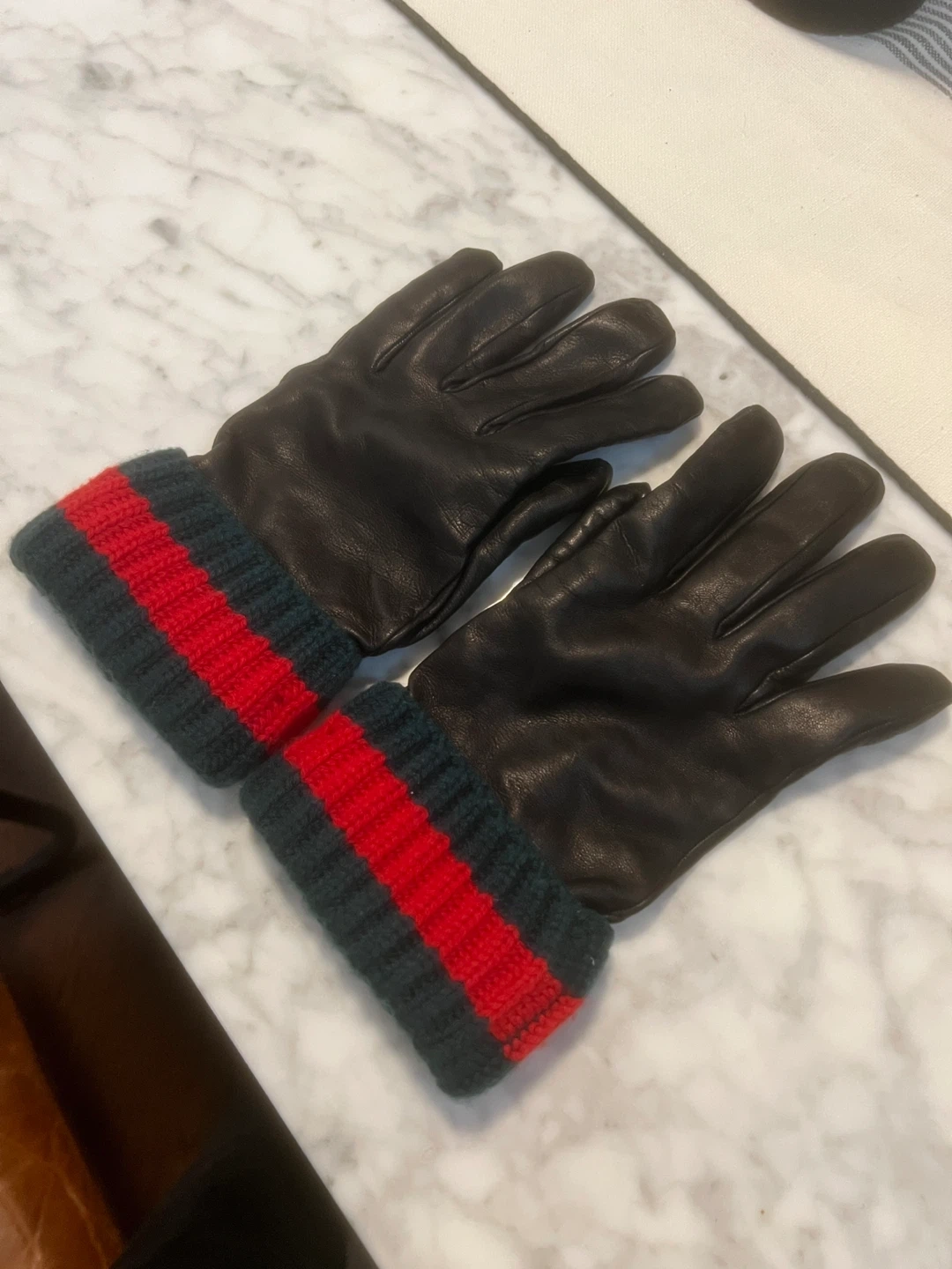 Authentic Gucci men’s leather gloves featuring the iconic green and red knit cuffs. Crafted from premium black leather with soft interior lining — elegant, timeless, and perfect for winter.