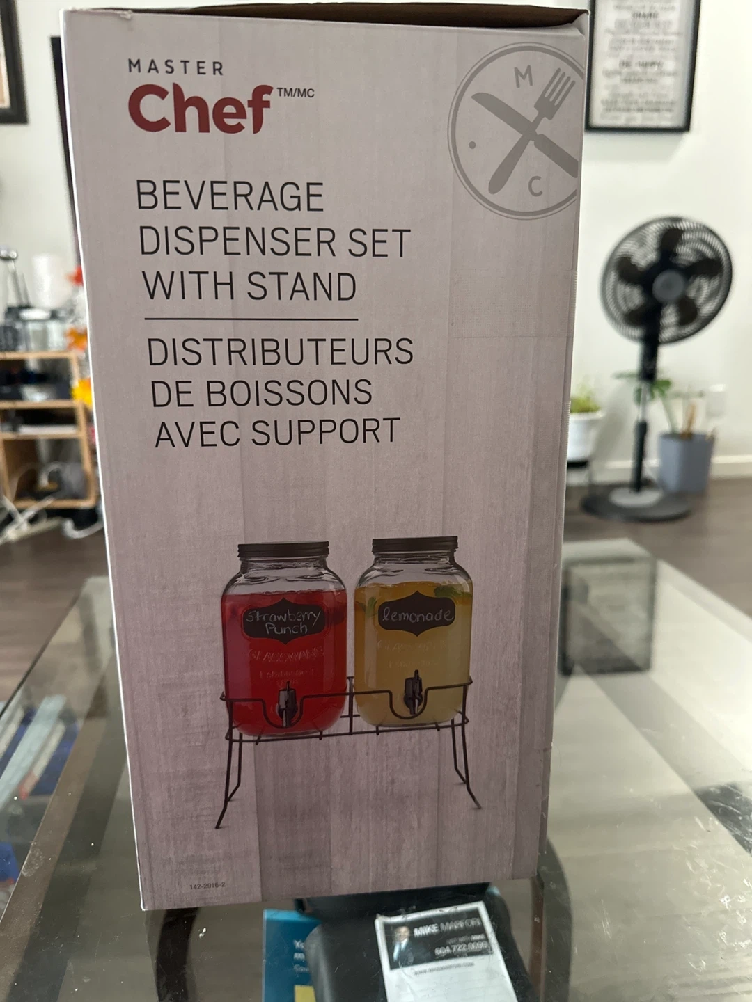 Selling a like brand new Master Chef beverage dispenser set with stand! It includes two 4L glass jars with easy-pour spouts, and a stand that holds both dispensers. Perfect for summer parties and gatherings!