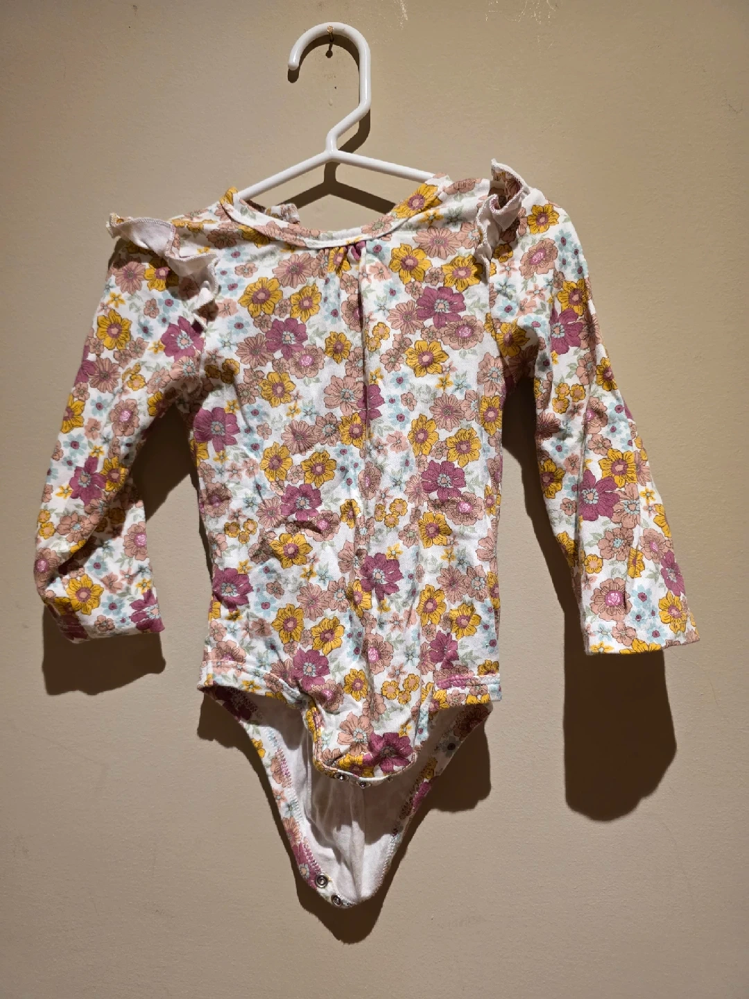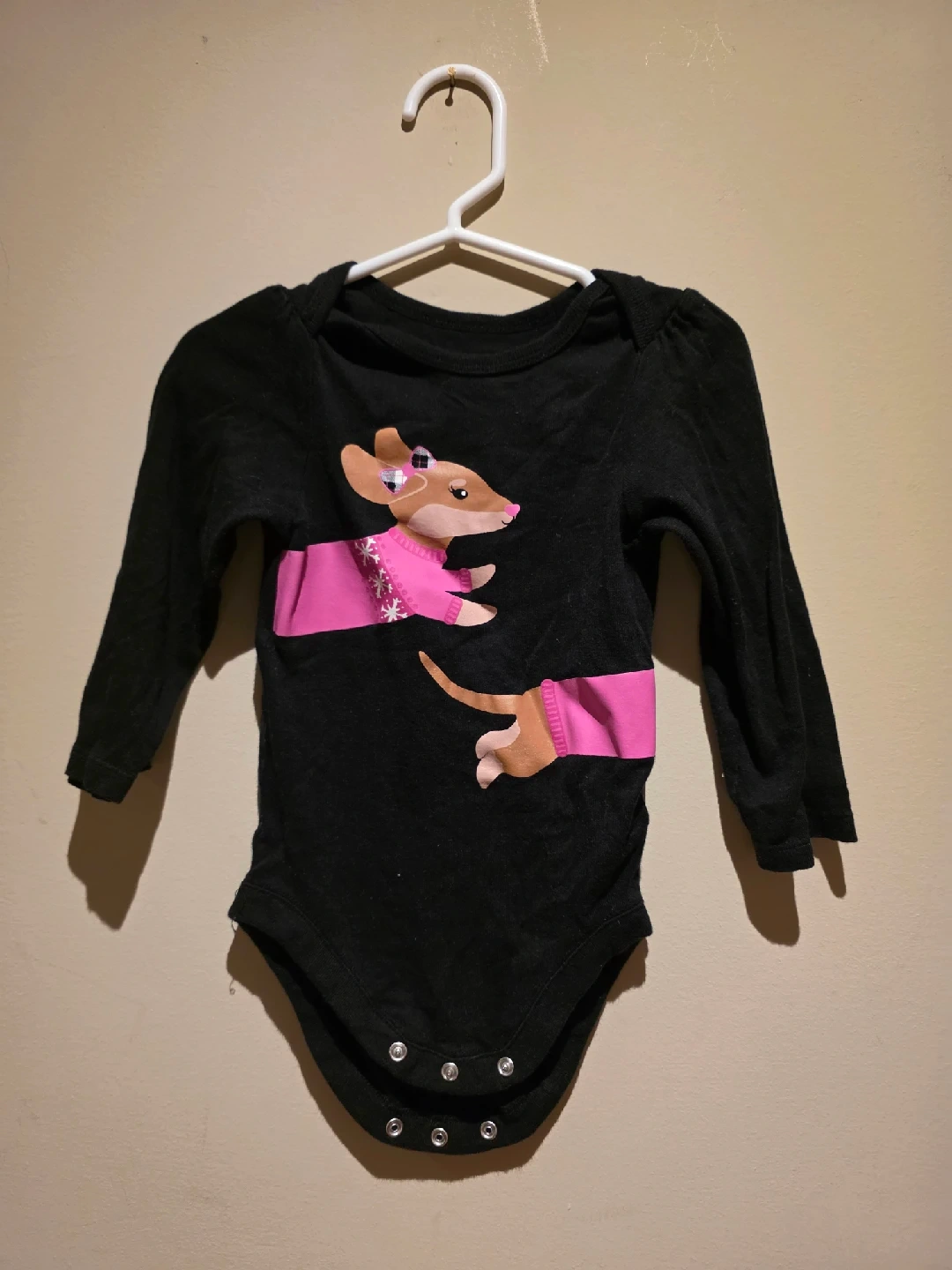 A collection of adorable baby bodysuits! There's a Carter's 24M navy blue bodysuit with a 'Sparkle saurus' design, a floral print bodysuit with ruffles, a pink bodysuit with an apple design, and a black bodysuit with a unique graphic
