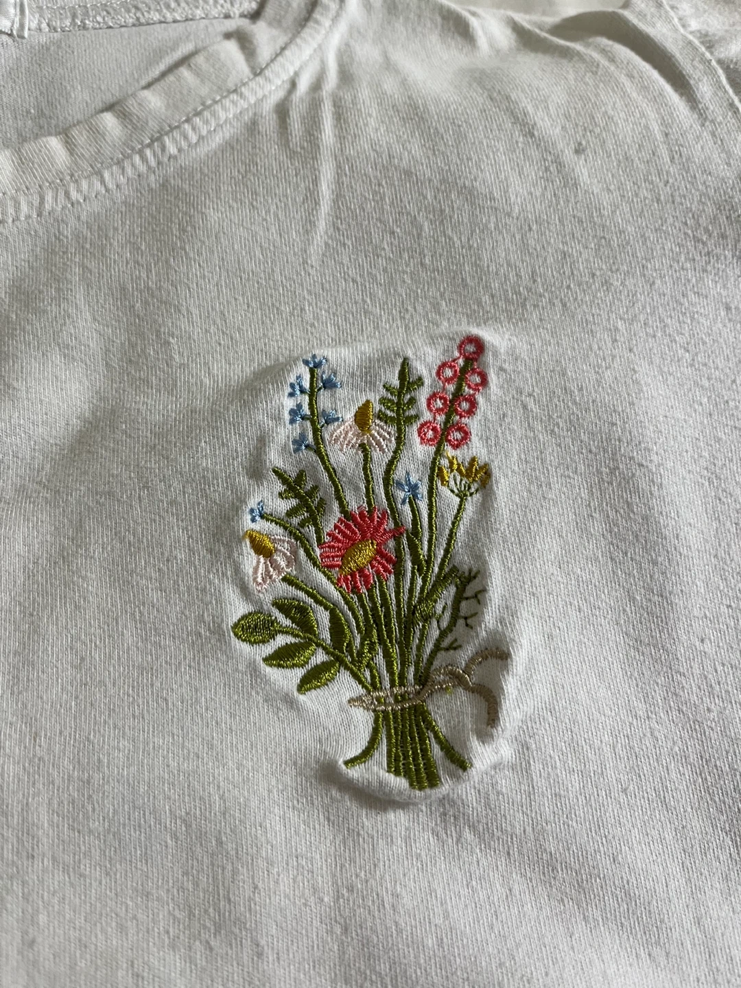 A cute and simple white T-shirt from Gencyish! It features a lovely floral embroidery design on the front. Perfect for adding a touch of charm to your everyday outfits.