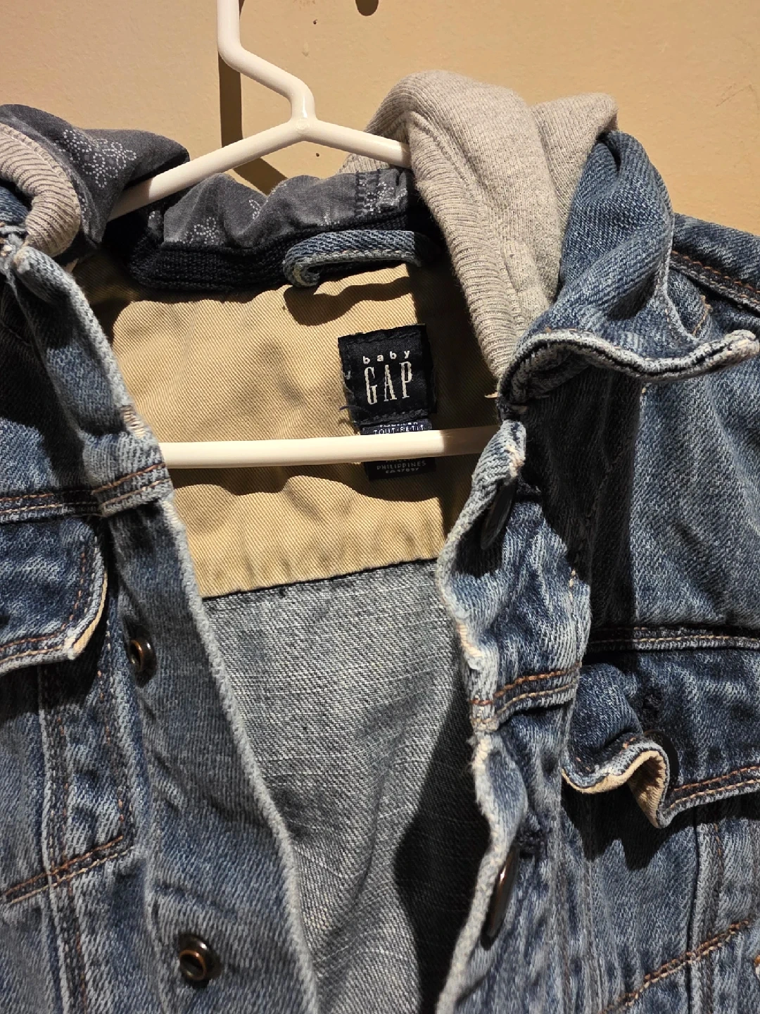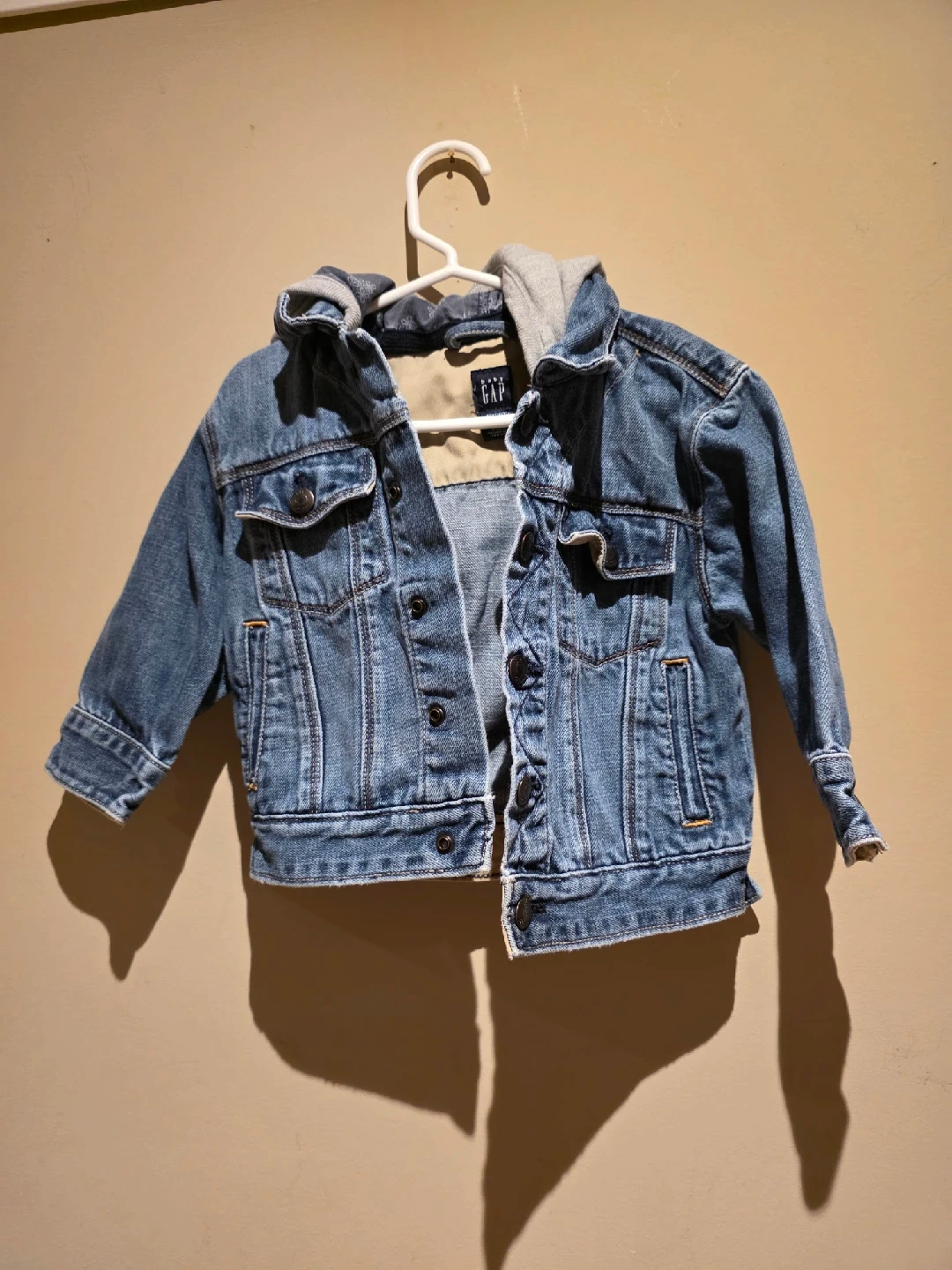 61A cute denim jacket from Baby Gap! It features a soft grey hood and classic denim look. Perfect for keeping your little one warm and stylish.