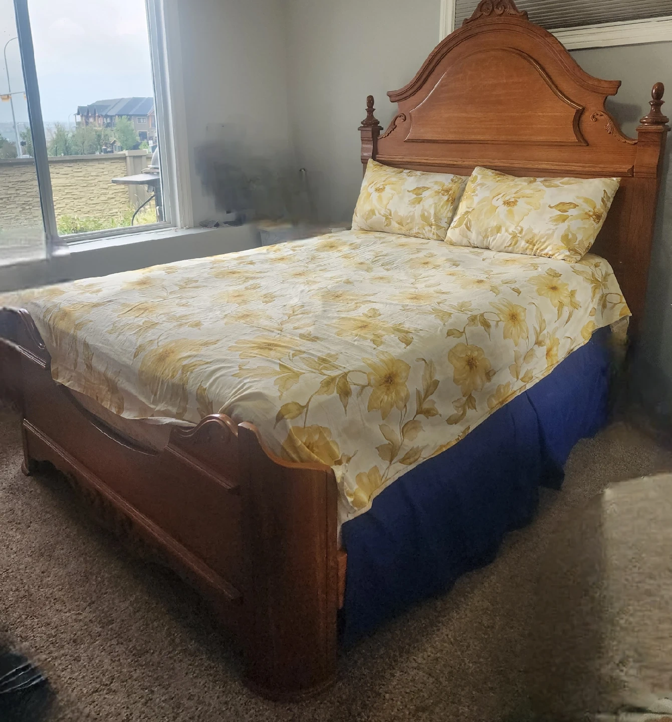 Bedroom set including a bed frame, dresser with mirror. The set is made of wood and has a traditional design. There are some signs of wear on the dresser, but overall it is in good condition.