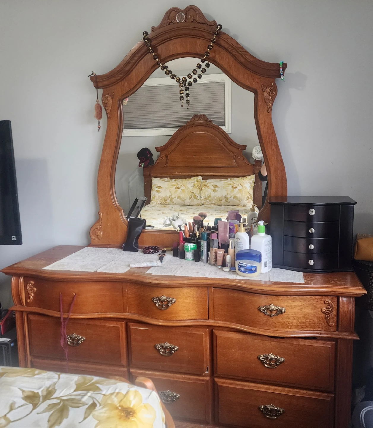 Bedroom set including a bed frame, dresser with mirror. The set is made of wood and has a traditional design. There are some signs of wear on the dresser, but overall it is in good condition.