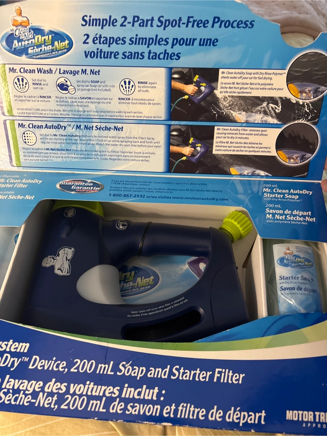 64Selling a Mr. Clean AutoDry Car Wash System. This includes the AutoDry device, 200 mL of soap, and a starter filter. It's a simple 2-part spot-free process for washing your car!