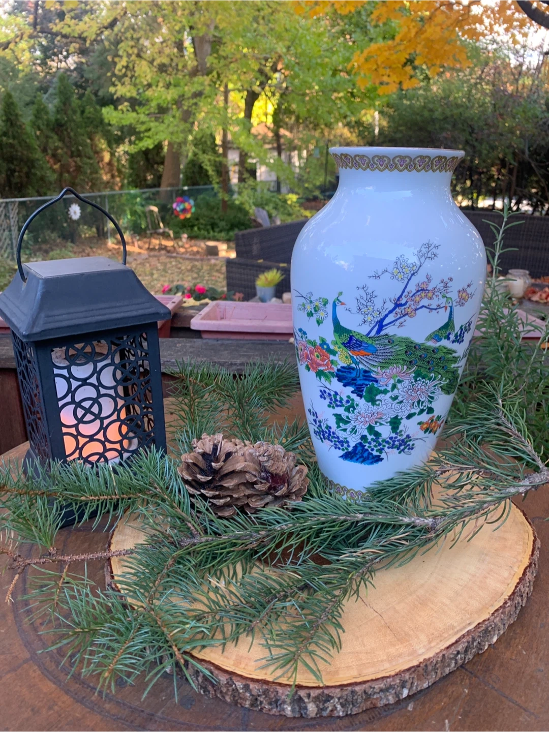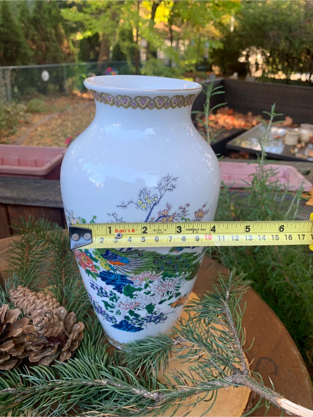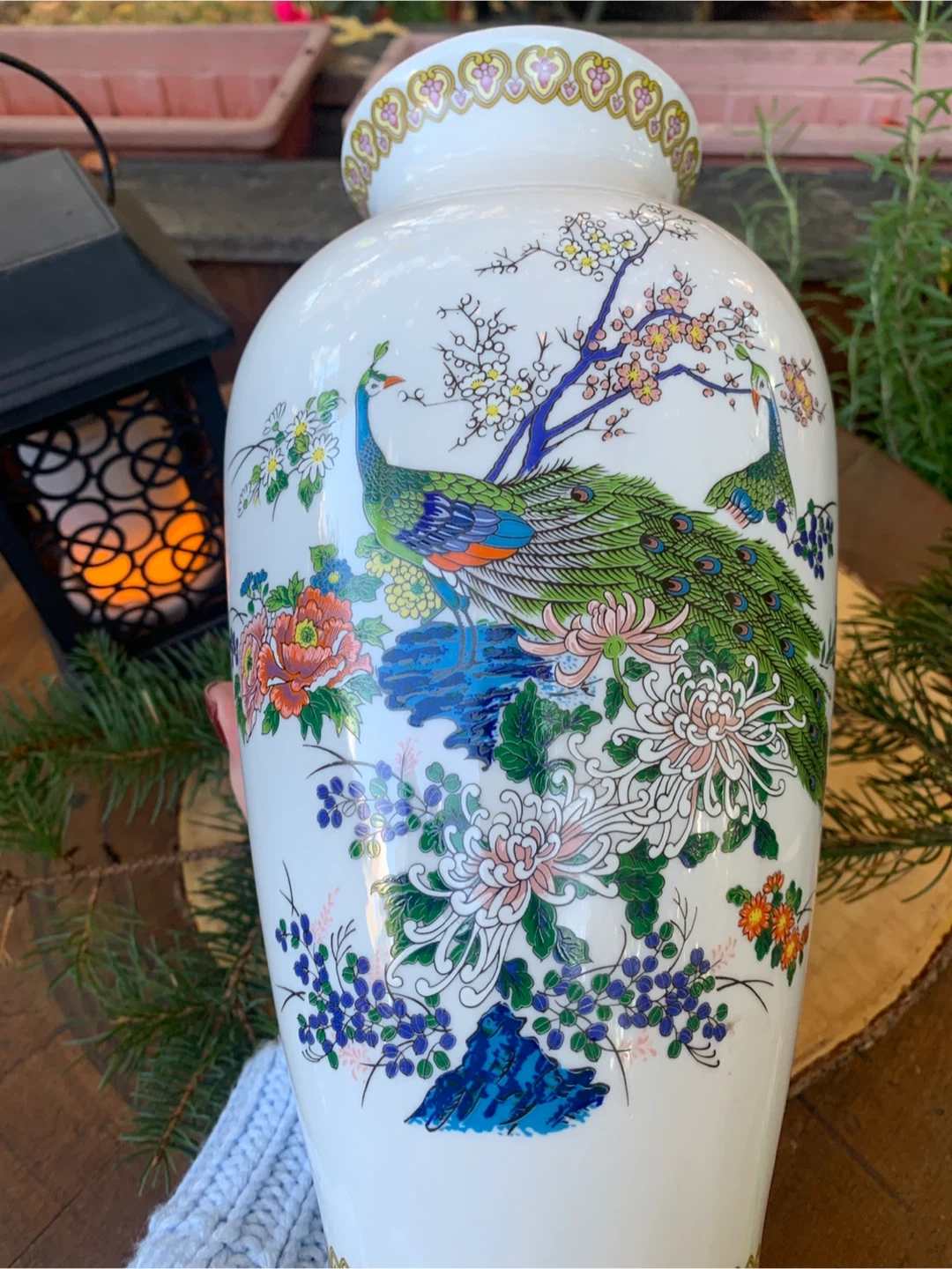 697Here's a beautiful vintage vase featuring peacocks and floral designs. It's in great shape with no chips, cracks or crazing and sits about 11” tall and 4” wide at the largest area. The colours in the design are gorgeous in blues, greens, pinks and some yellow. I believe this piece is made in Taiwan, although the sticker is missing on the bottom. A really nice Asian decor item that can be enjoyed by you or given as a gift! Cash only please. Props not included.