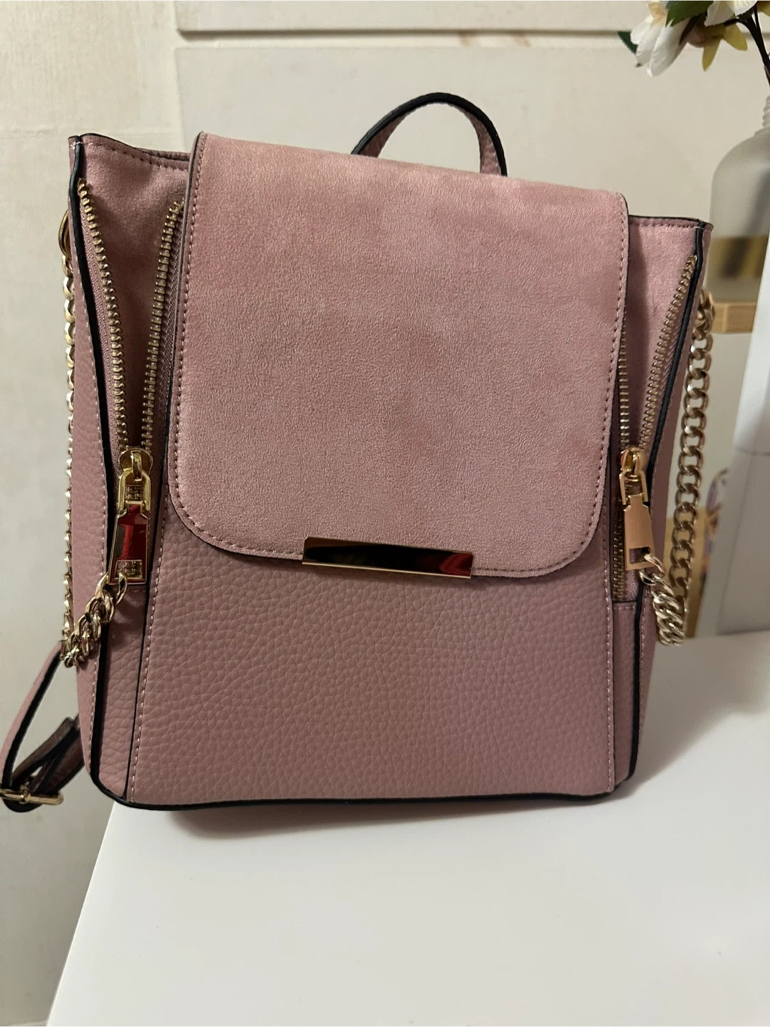 113This is a lovely pink mini backpack from Call it Spring. It's in great condition and ready for a new home! It features gold chain detailing and a unique design.