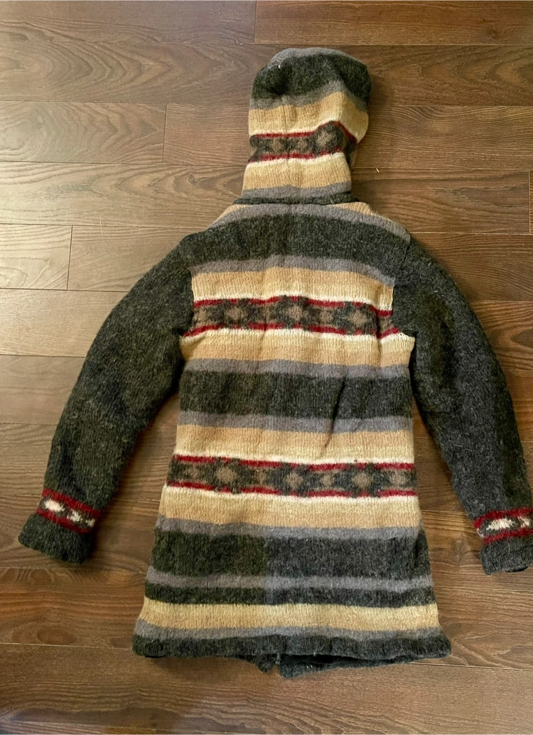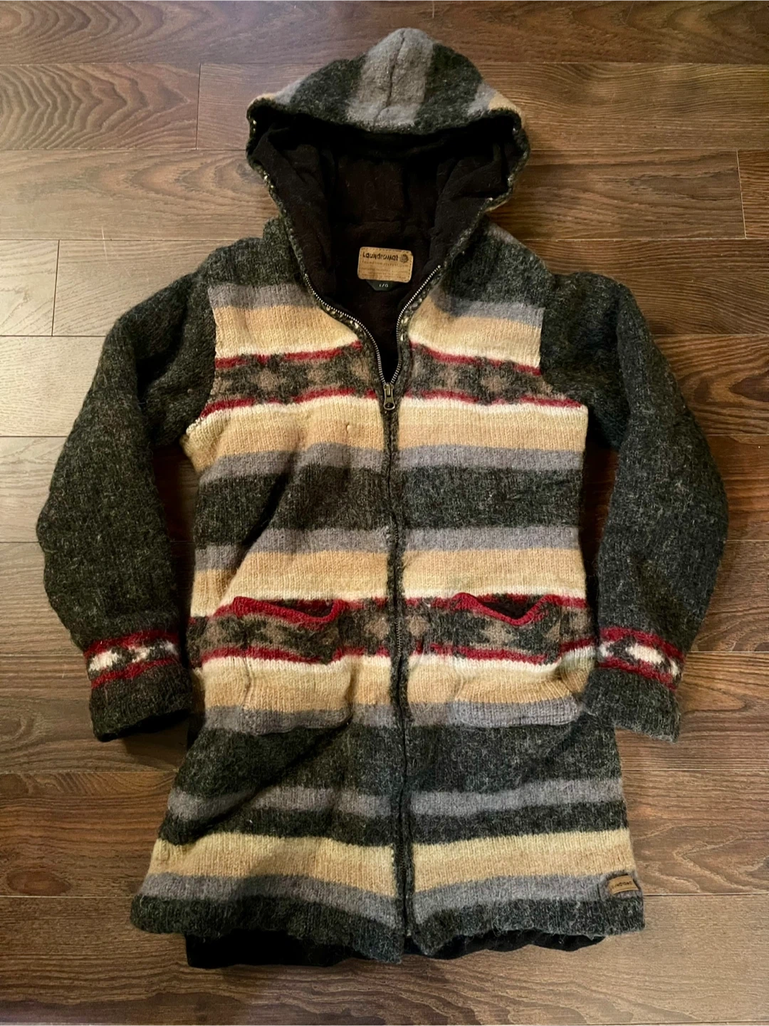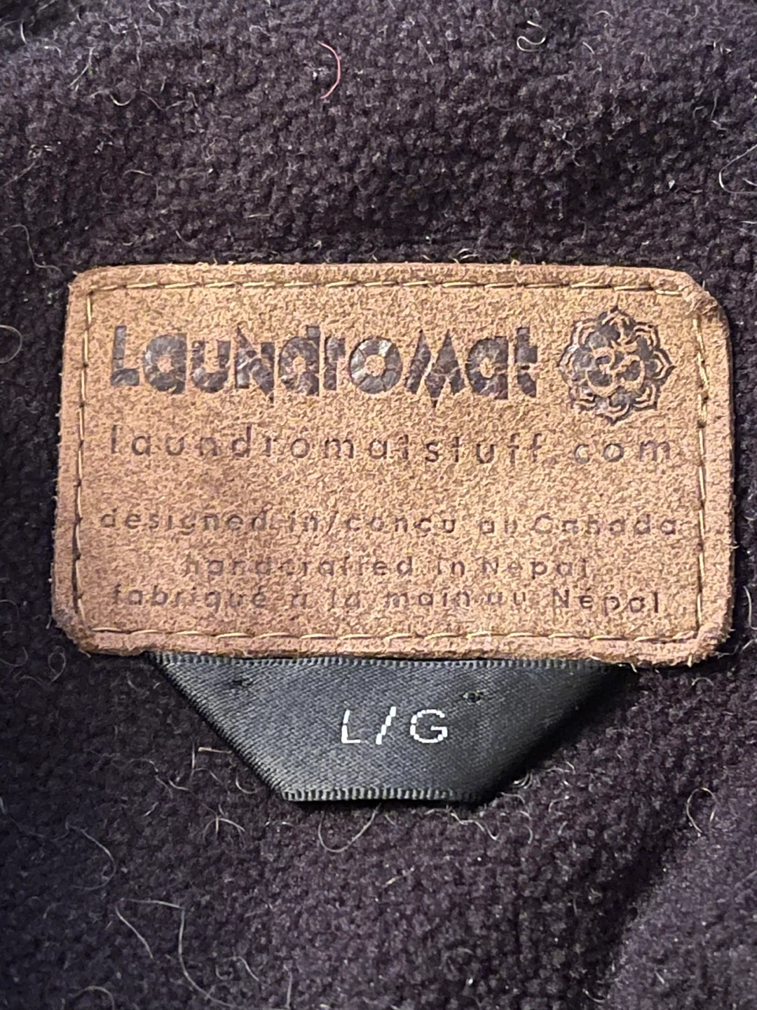 Cozy up in this Laundromat hooded jacket! It's a size large and features a unique striped pattern in earth tones. Perfect for adding a touch of warmth and style to your wardrobe
