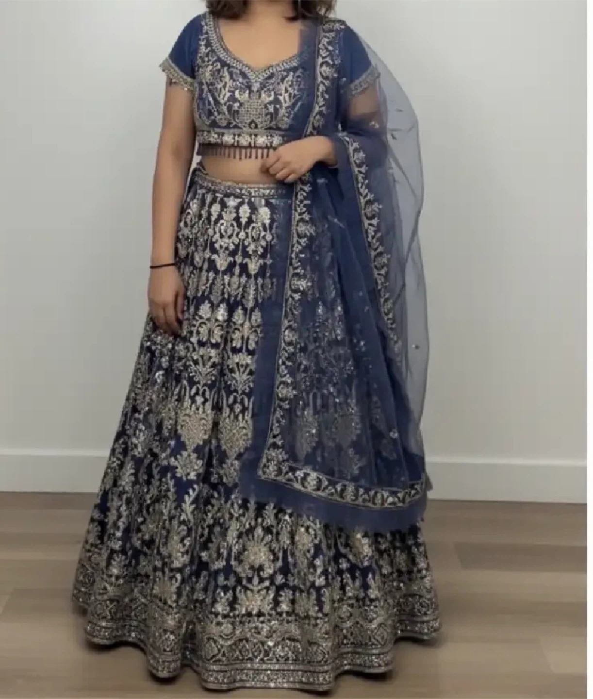 Beautiful blue lehenga choli with intricate silver embroidery. Perfect for a special occasion! The set includes a skirt (lehenga), a blouse (choli), and a dupatta. It's in great condition and ready to wear!
