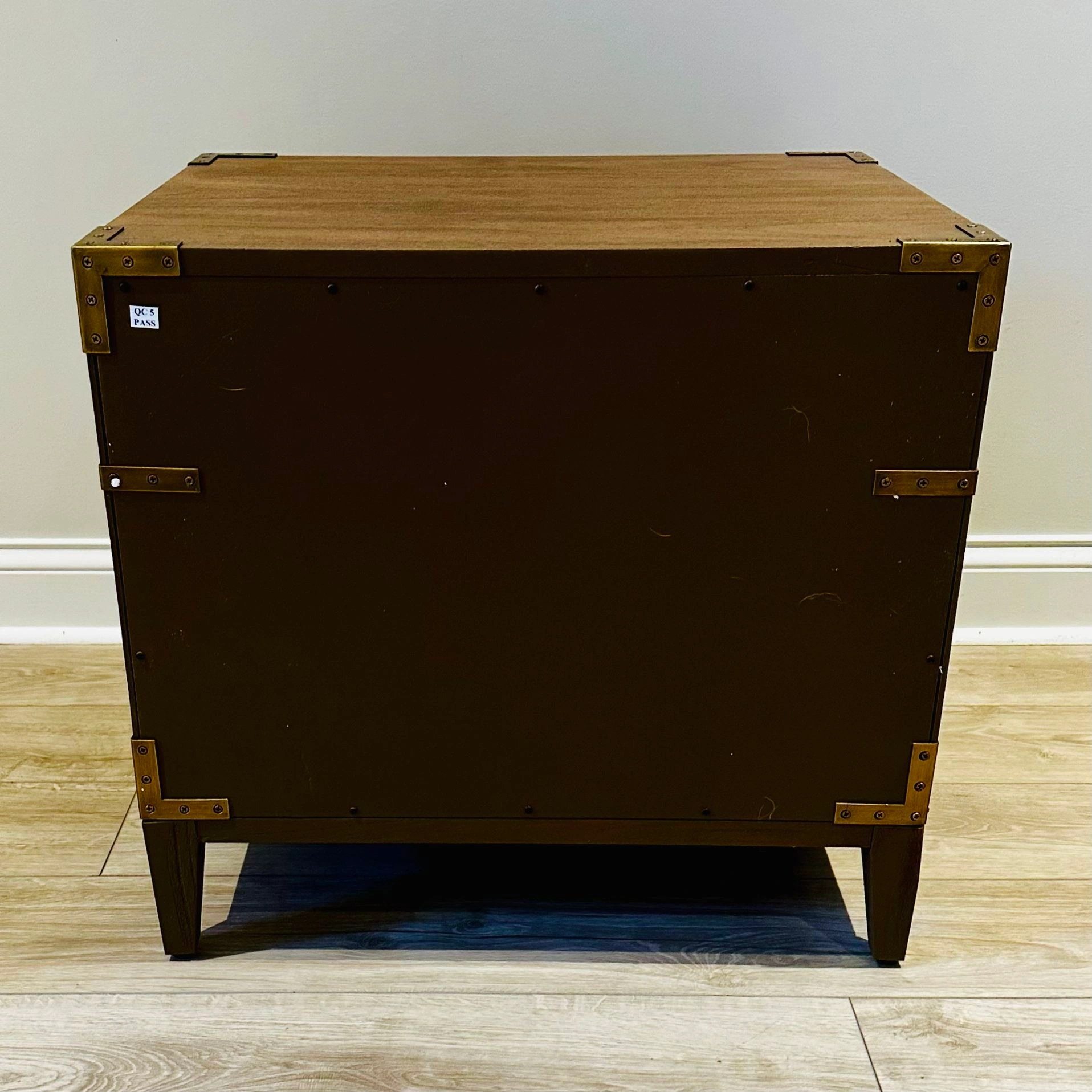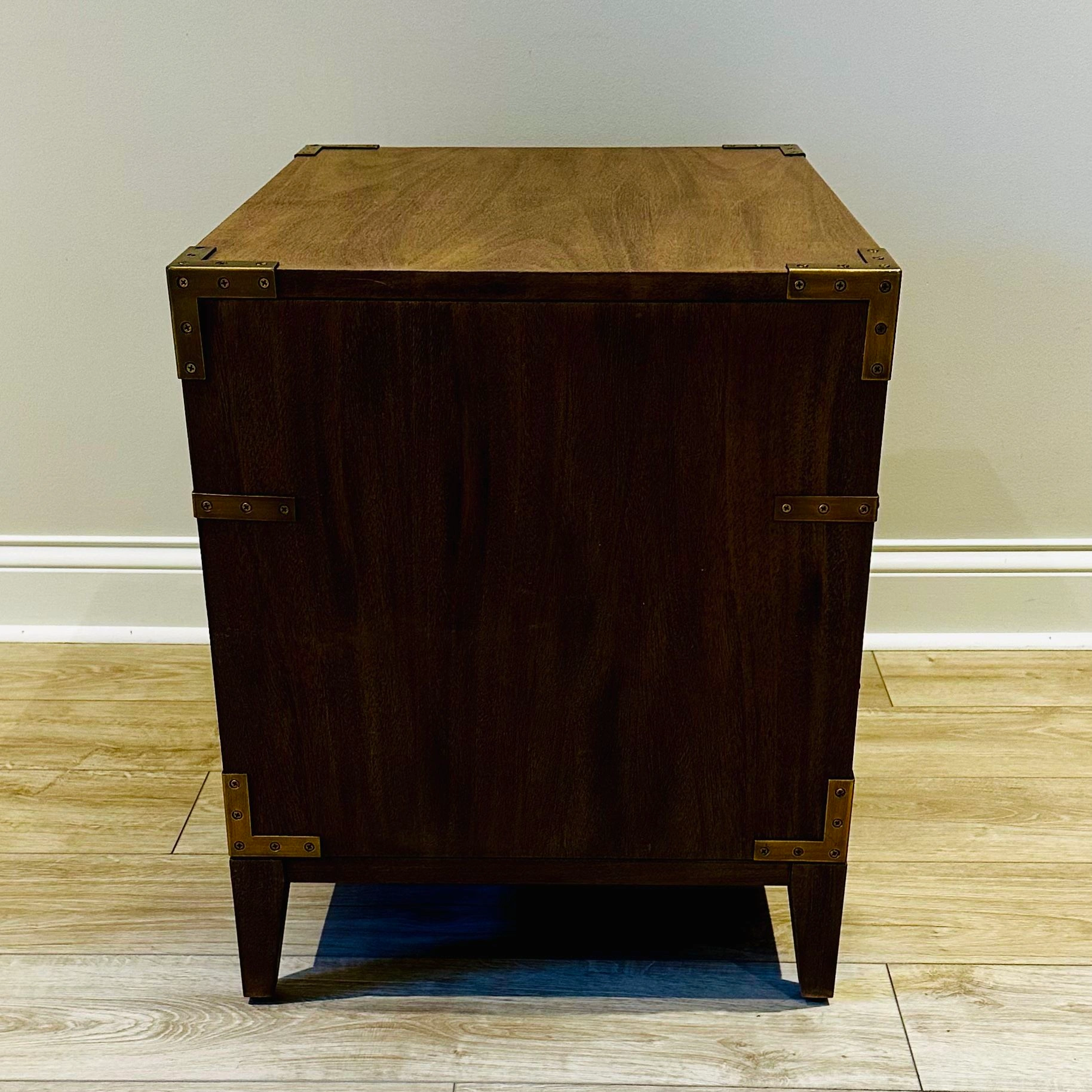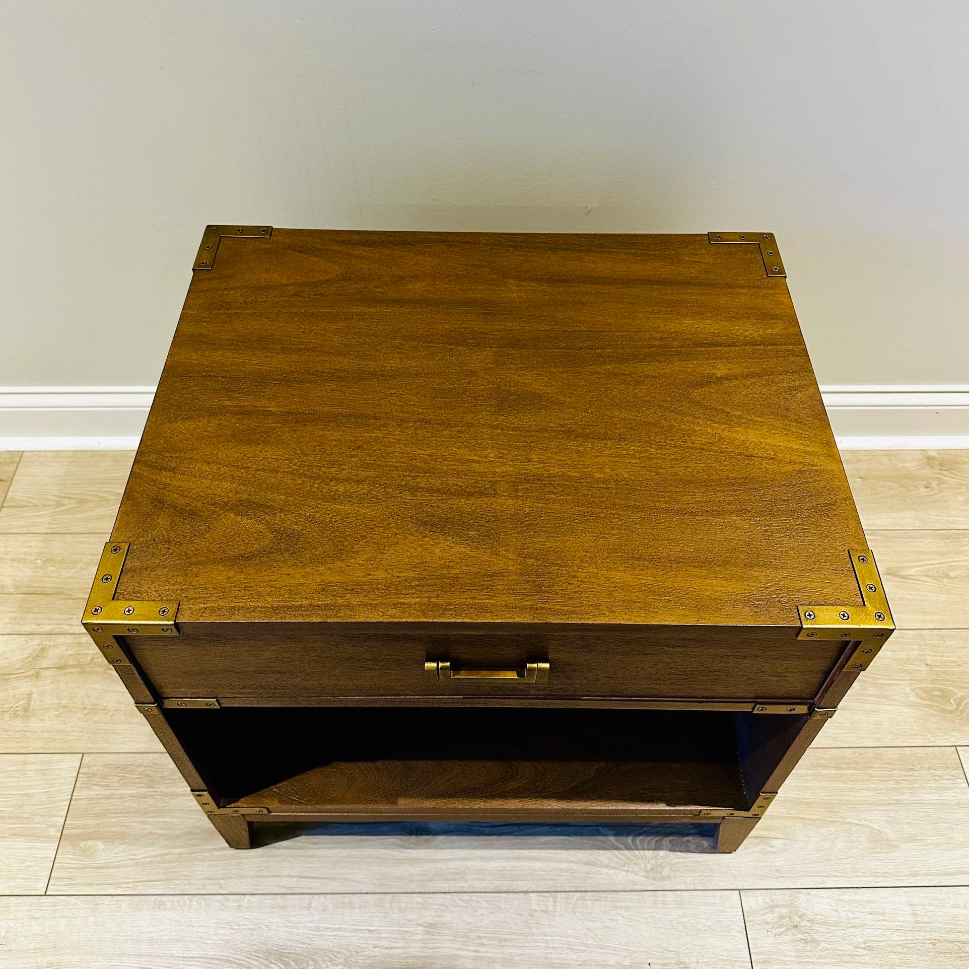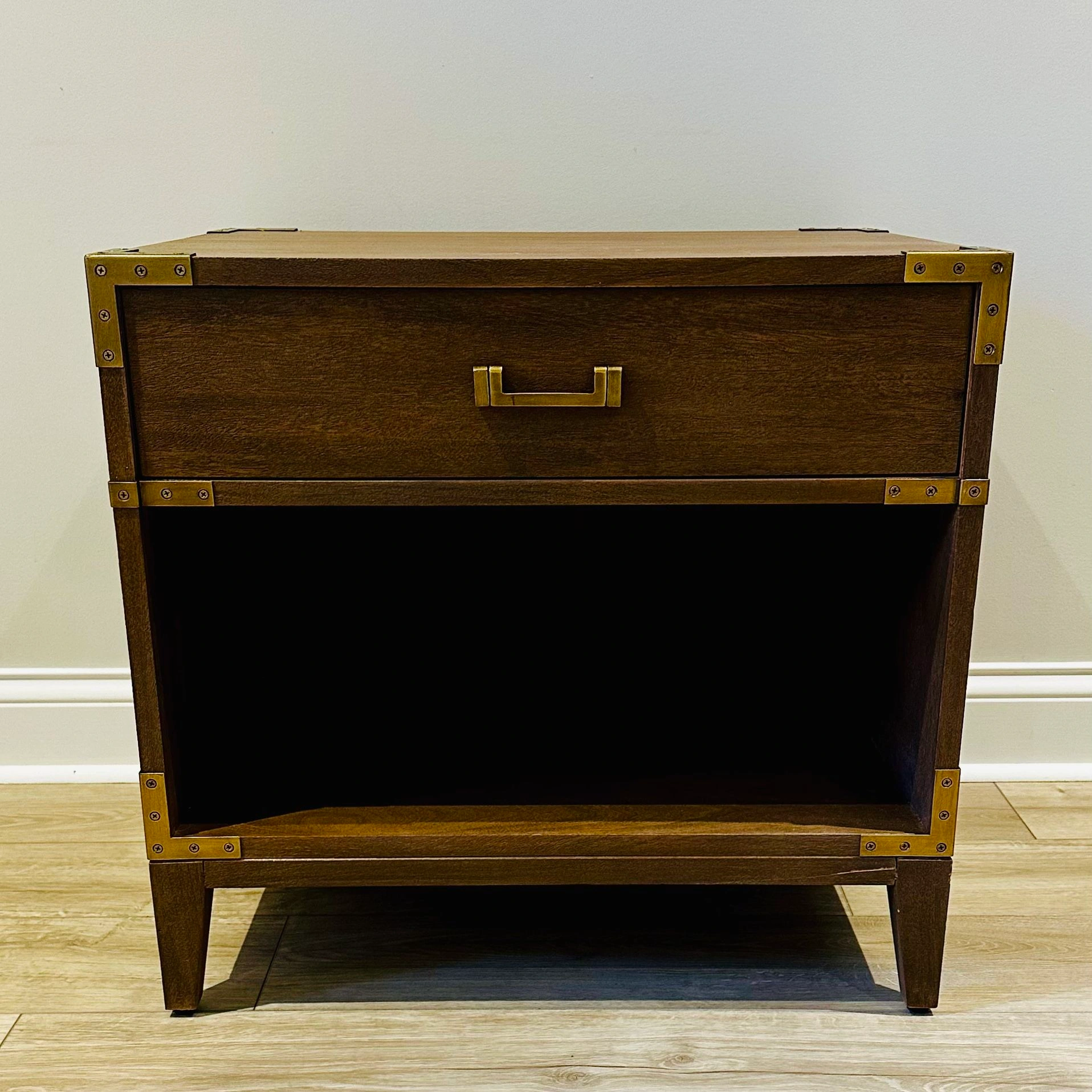 75BNIB - Safavieh Couture Nisha 1-Drawer 1-Shelf Wood Nightstand - Set of 2 - Antiqued brass hardware and nailhead details on brown mahogany frame - Great condition, one leg on one of the nightstands appears to have been repaired by store. No issues. - Purchased in original packaging. Missed return deadline. One was removed from packaging for pictures but repackaged. Never used. - Wood: MDF and Mahogany Veneer - Metal: Brass - Dimensions (W * D * H): 26" X 20" X 24" - Drawer/Shelf Dimensions: 21.3" X 14.4" X 5.4" - Weight: 53.9lbs $300 for one, $550 for set Color: Brown Material: Wood, Metal Item Height: 20-24 in Item Width: 24-30 in Brand: Safavieh Couture Item Depth: 12-23 in