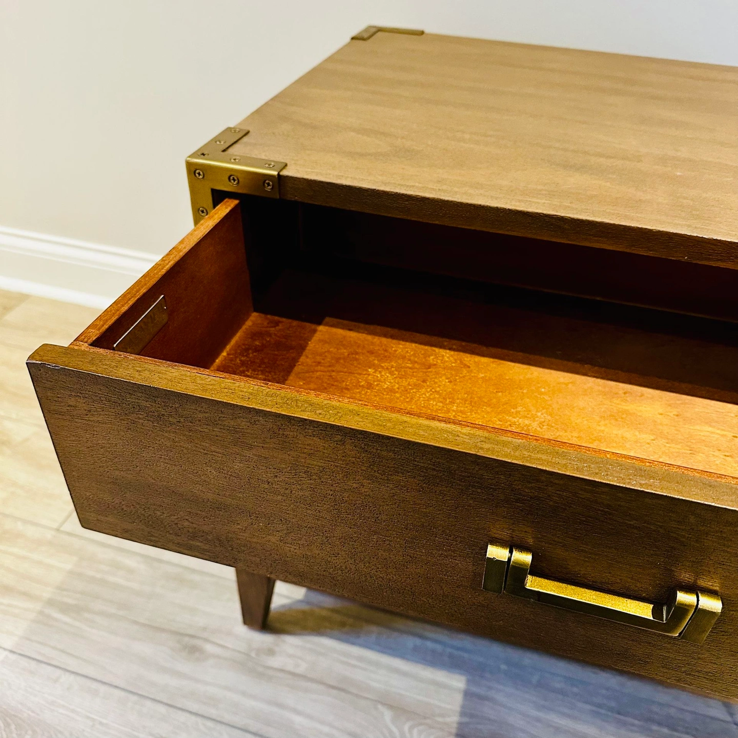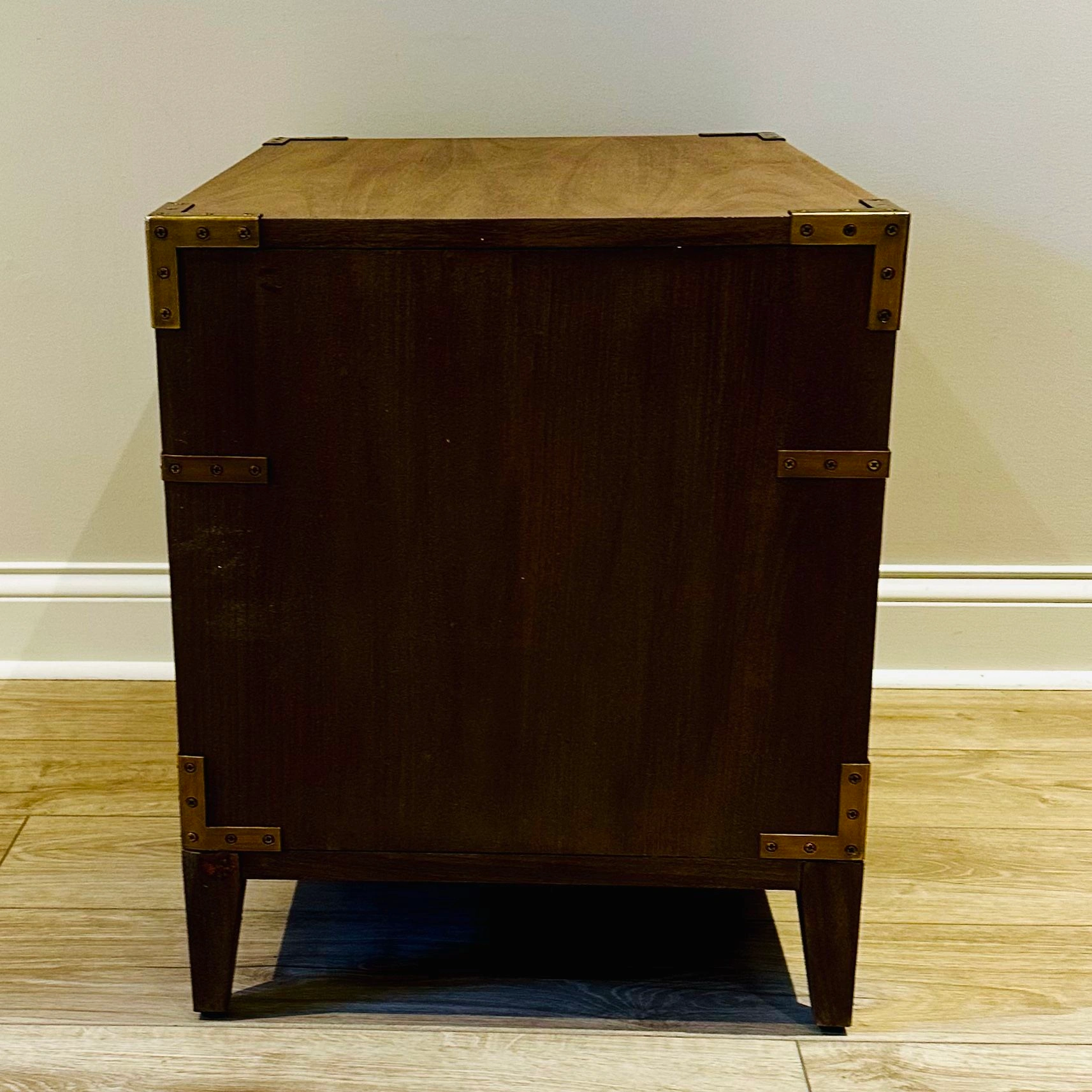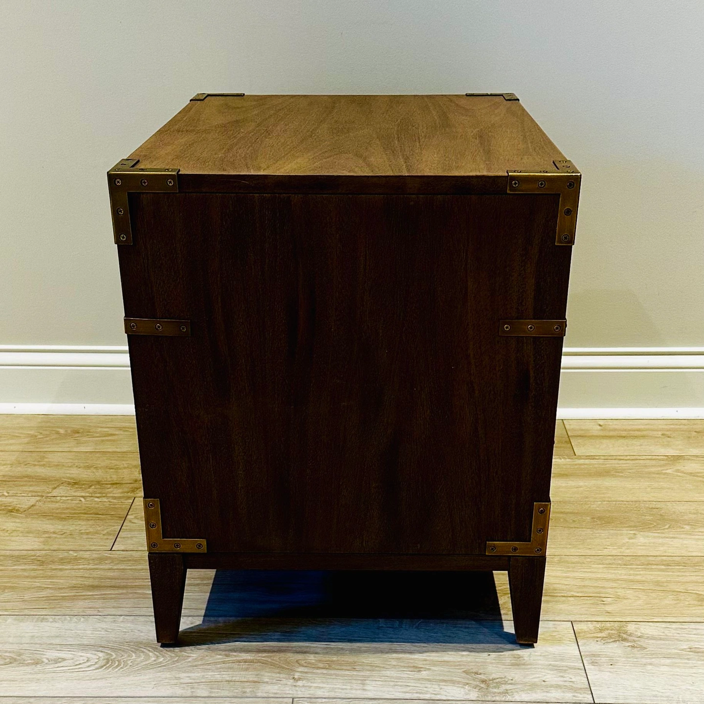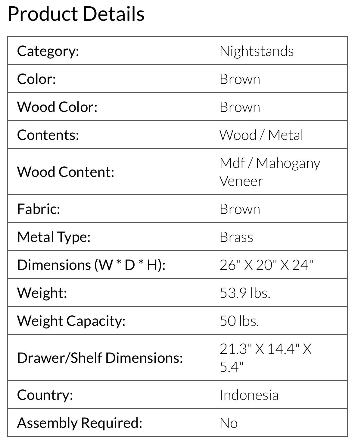 75BNIB - Safavieh Couture Nisha 1-Drawer 1-Shelf Wood Nightstand - Set of 2 - Antiqued brass hardware and nailhead details on brown mahogany frame - Great condition, one leg on one of the nightstands appears to have been repaired by store. No issues. - Purchased in original packaging. Missed return deadline. One was removed from packaging for pictures but repackaged. Never used. - Wood: MDF and Mahogany Veneer - Metal: Brass - Dimensions (W * D * H): 26" X 20" X 24" - Drawer/Shelf Dimensions: 21.3" X 14.4" X 5.4" - Weight: 53.9lbs $300 for one, $550 for set Color: Brown Material: Wood, Metal Item Height: 20-24 in Item Width: 24-30 in Brand: Safavieh Couture Item Depth: 12-23 in