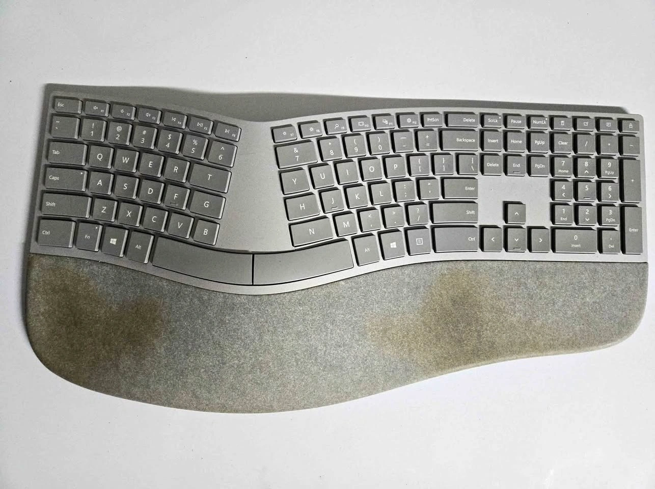 70Selling Surface Ergonomic Keyboard, works with both Mac and Windows. Needs 2 AAA batteries to function. The main issue is the FN key is not working. Alcantara surface needs deep cleaning.