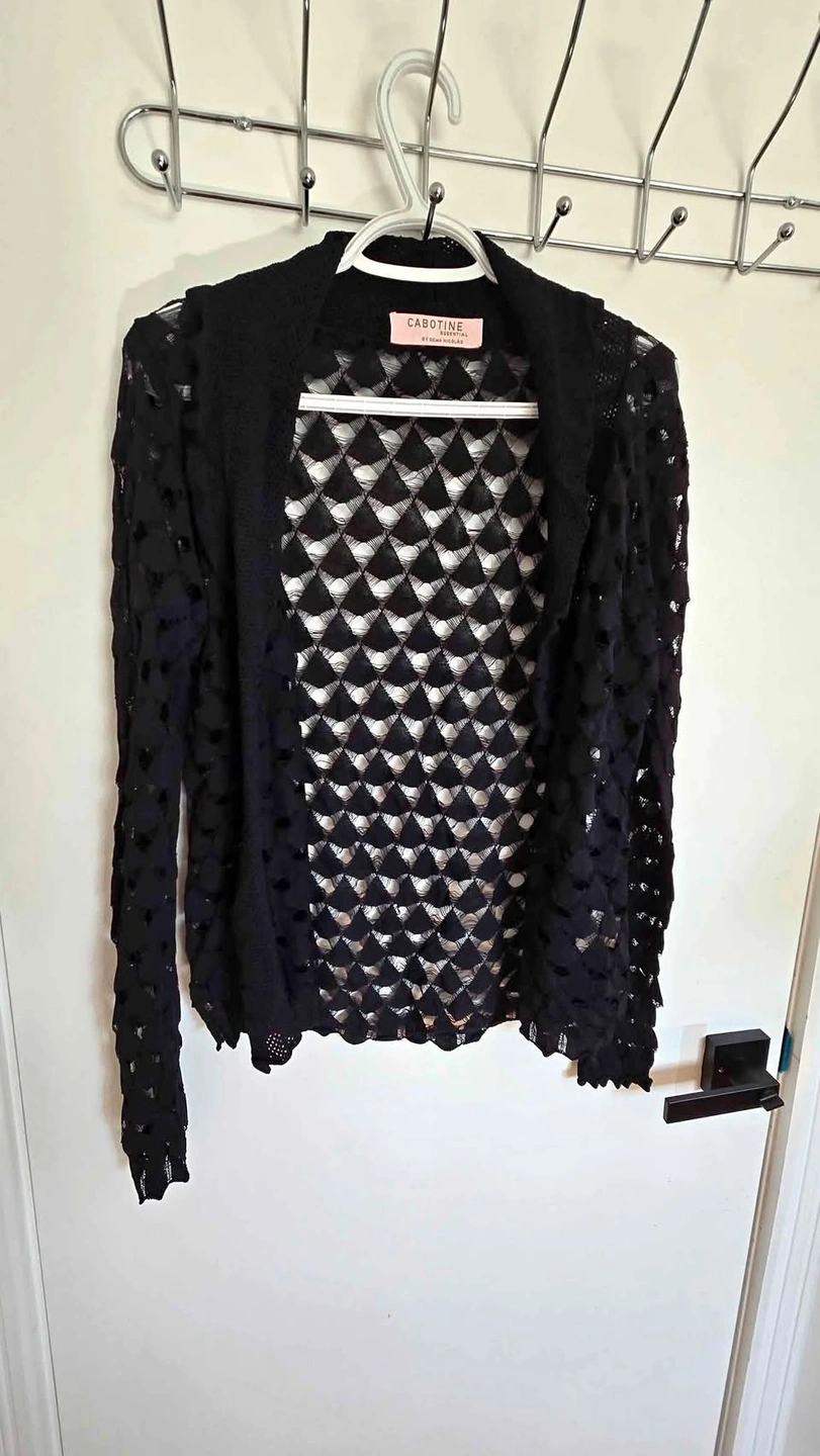 Black lace-style open cardigan – perfect layering piece for any outfit. Never worn, versatile for casual wear or as a stylish touch for Halloween costumes.