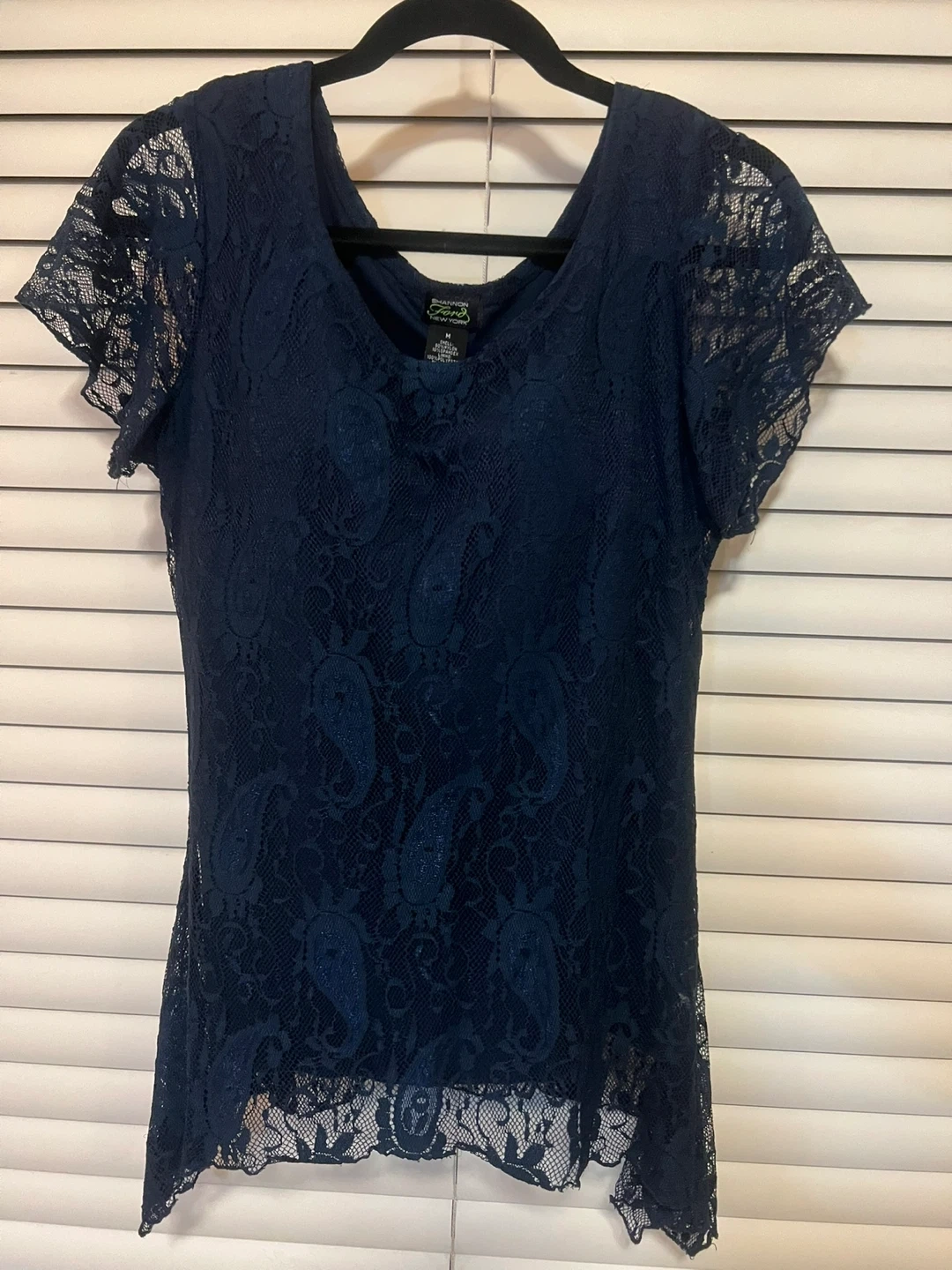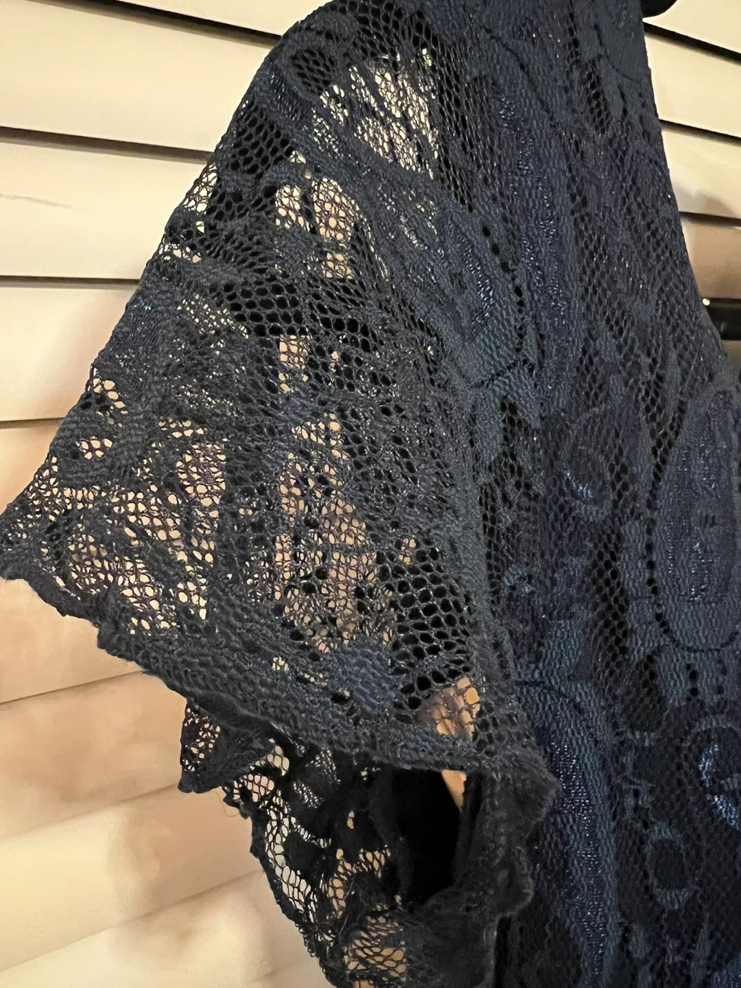 21Selling a lovely lace top from Shannon Ford New York! It's a beautiful navy blue colour and size medium. The shell is made of 90% nylon and 10% spandex, with a 100% polyester lining. It's in great condition and ready for a new home