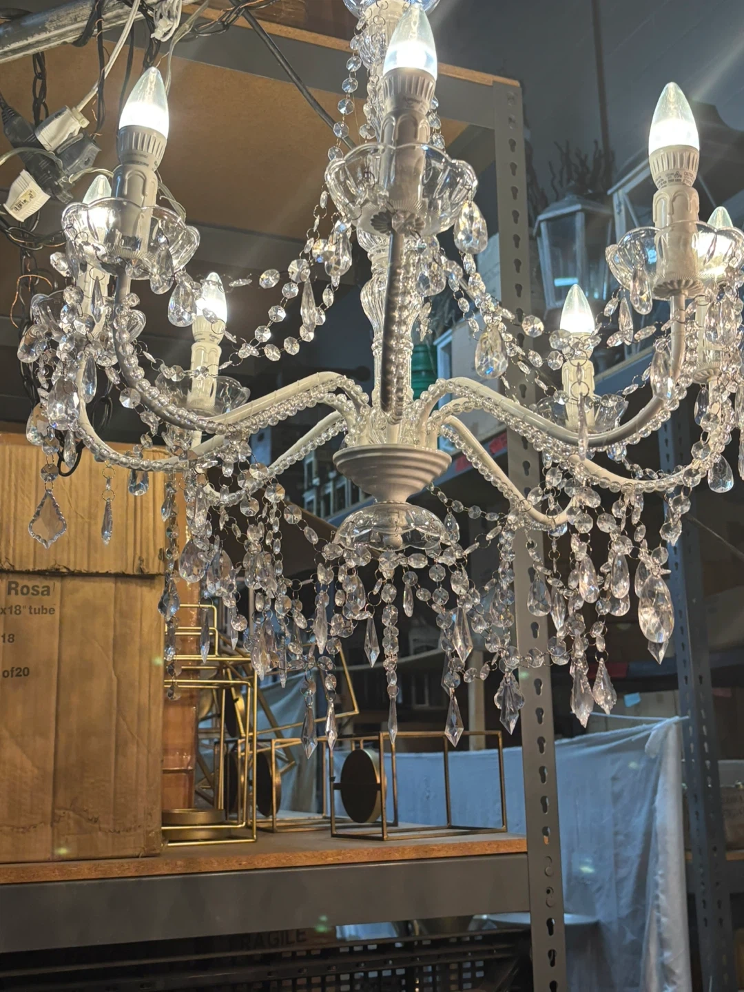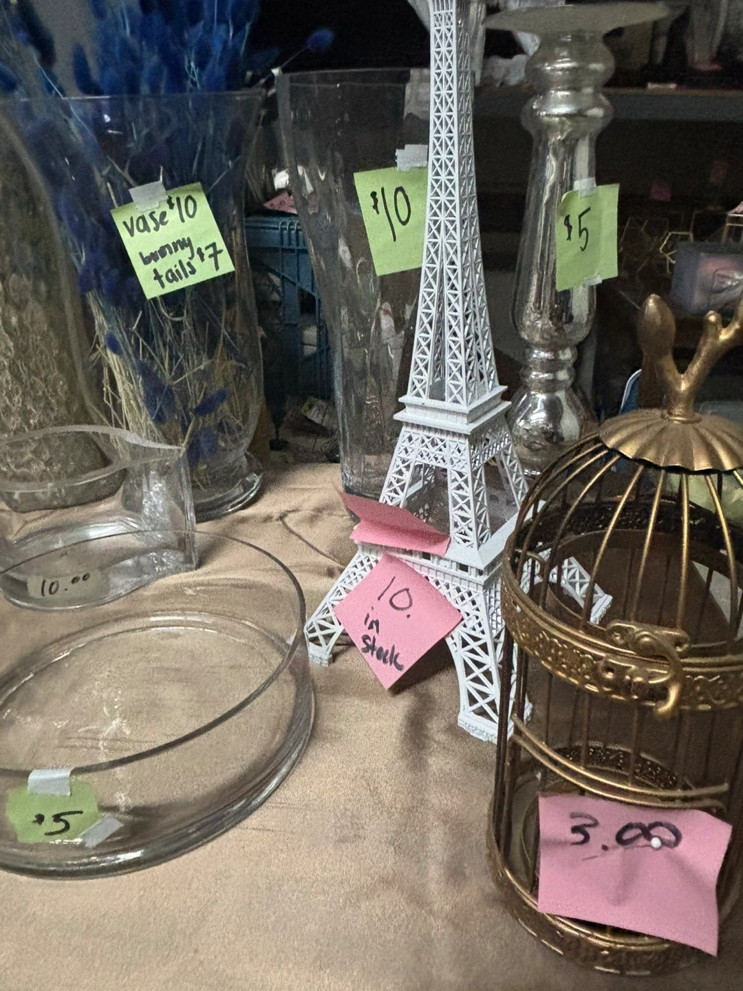 Chandeliers, vases, candle holders, stands, lamps, Halloween decor, Christmas decor, fabrics, lace, overlays, etc.