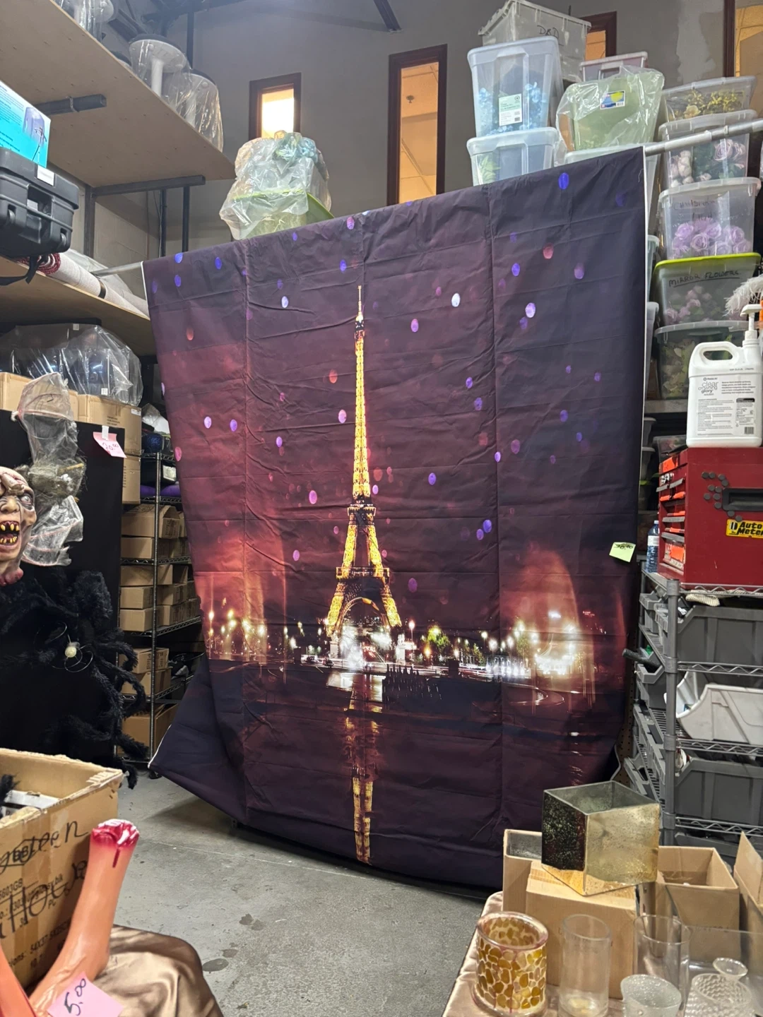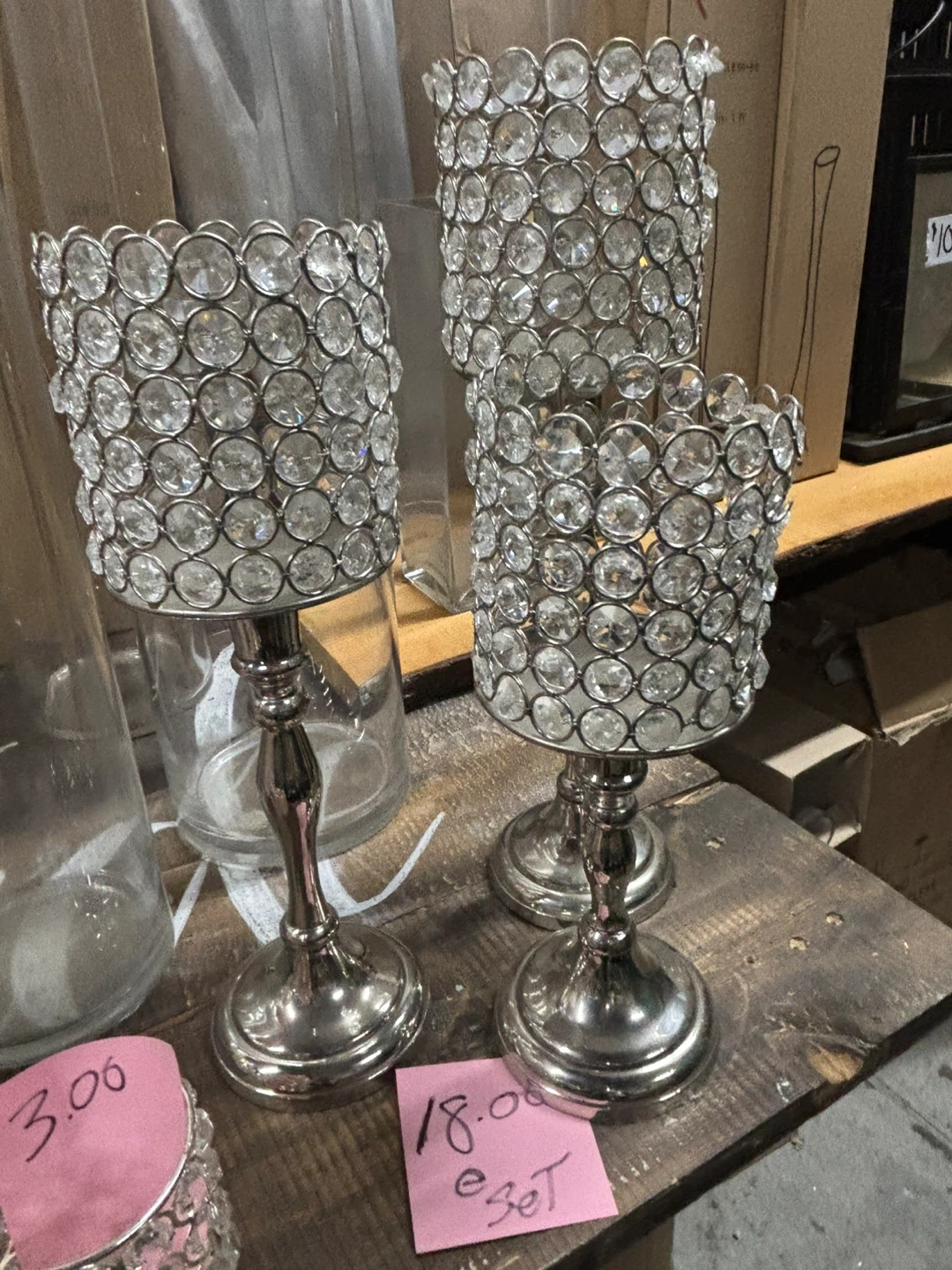 Chandeliers, vases, candle holders, stands, lamps, Halloween decor, Christmas decor, fabrics, lace, overlays, etc.