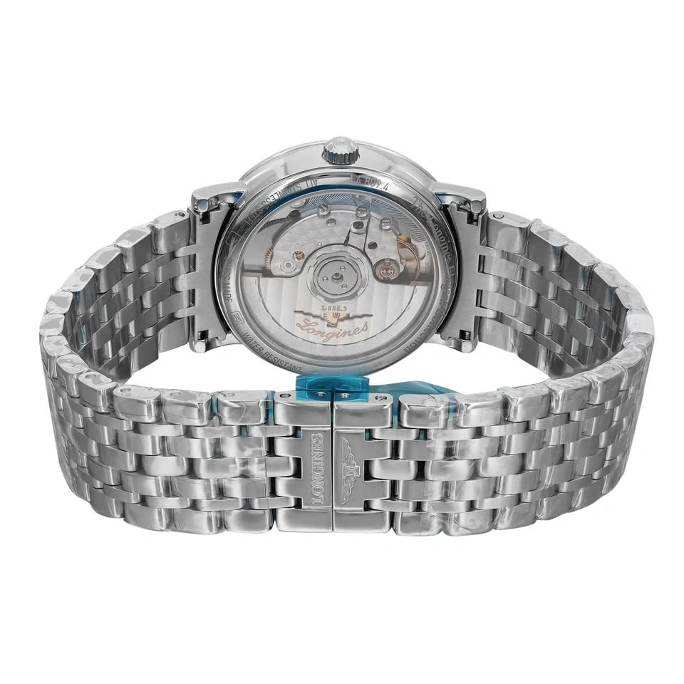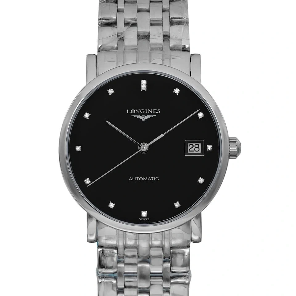 This exquisite Longines Elegant L4.809.4.57.6 watch is unworn and still has the original factory plastic on. It comes with a Longines hang tag for authenticity, though the original box and papers are not included. It has a 34.5mm stainless steel case and a black dial with 13 diamond hour markers. The Swiss automatic movement has a power reserve of approximately 45 to 64 hours. The maximum wrist size it fits is 7.75 inches.