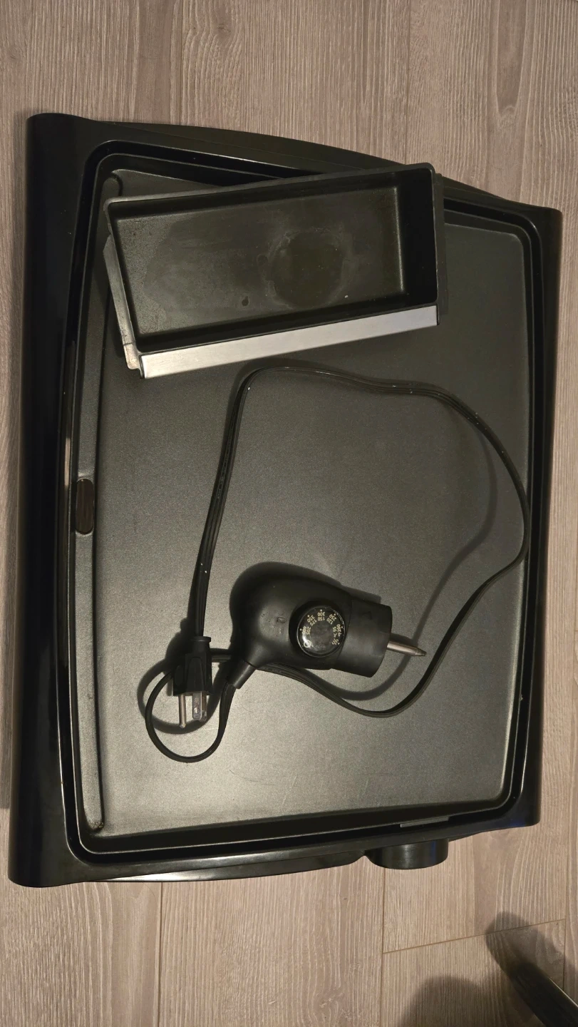 Large black cooking griddle. Non stick surface , comes with cable and grease trap.