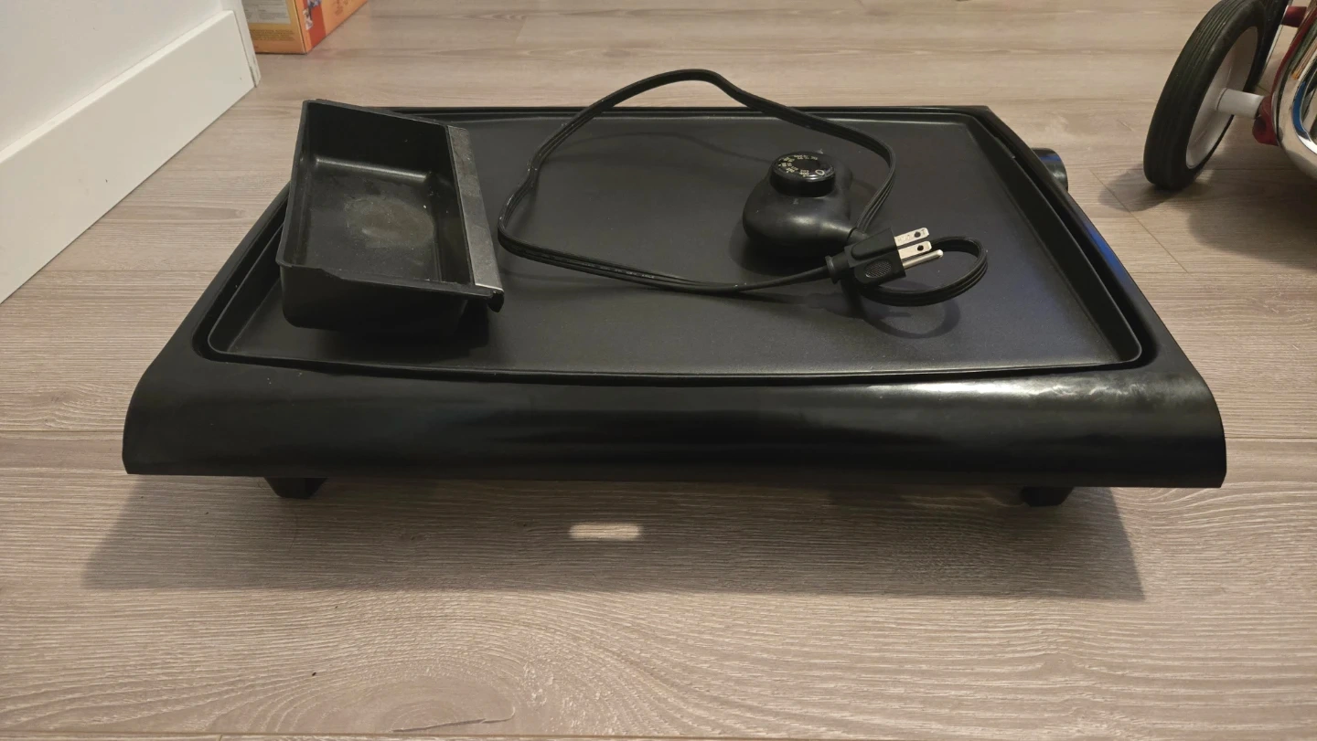 Large black cooking griddle. Non stick surface , comes with cable and grease trap.