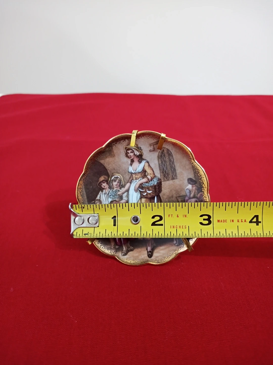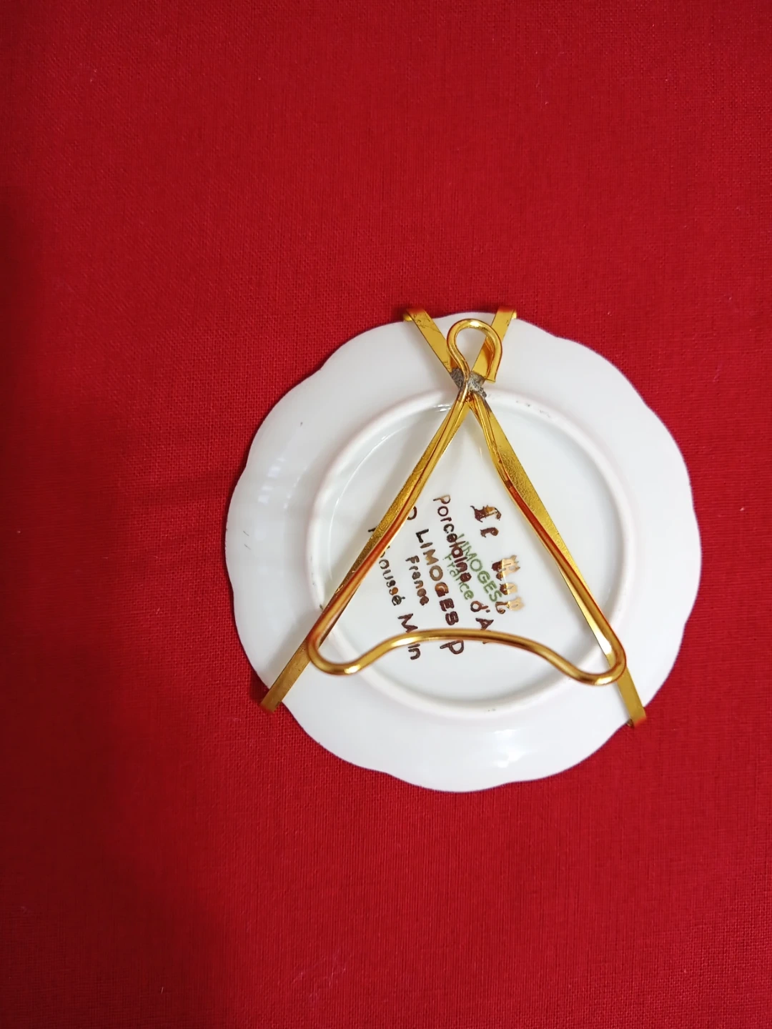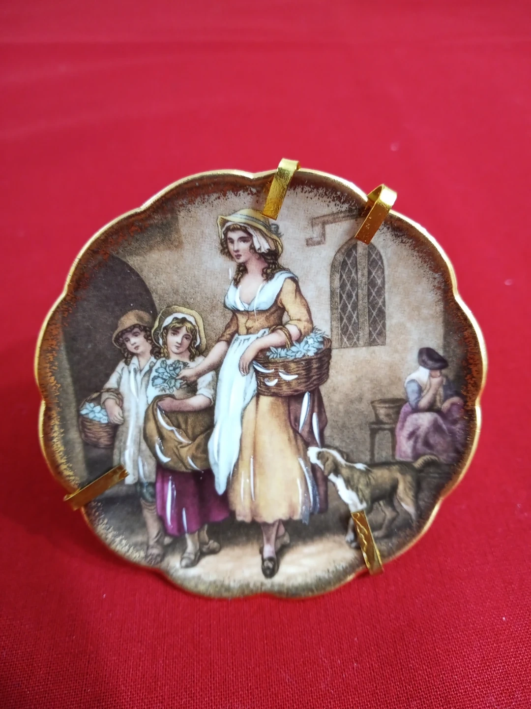 A decorative mini porcelain plate from Limoges, France. It features a charming scene of children and a dog. It's a beautiful piece for display!
