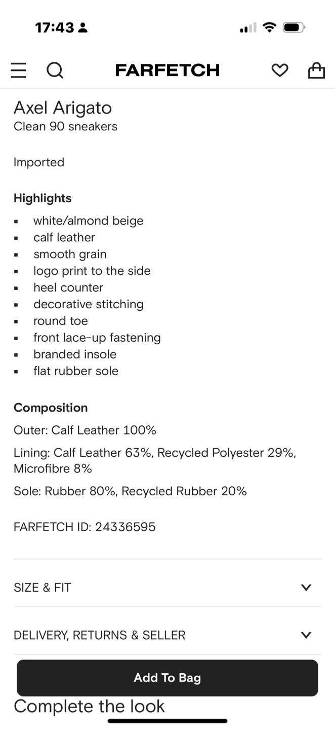 The outer is made of 100% calf leather, the lining is 63% calf leather, 29% recycled polyester, and 8% microfibre. The sole is 80% rubber and 20% recycled rubber