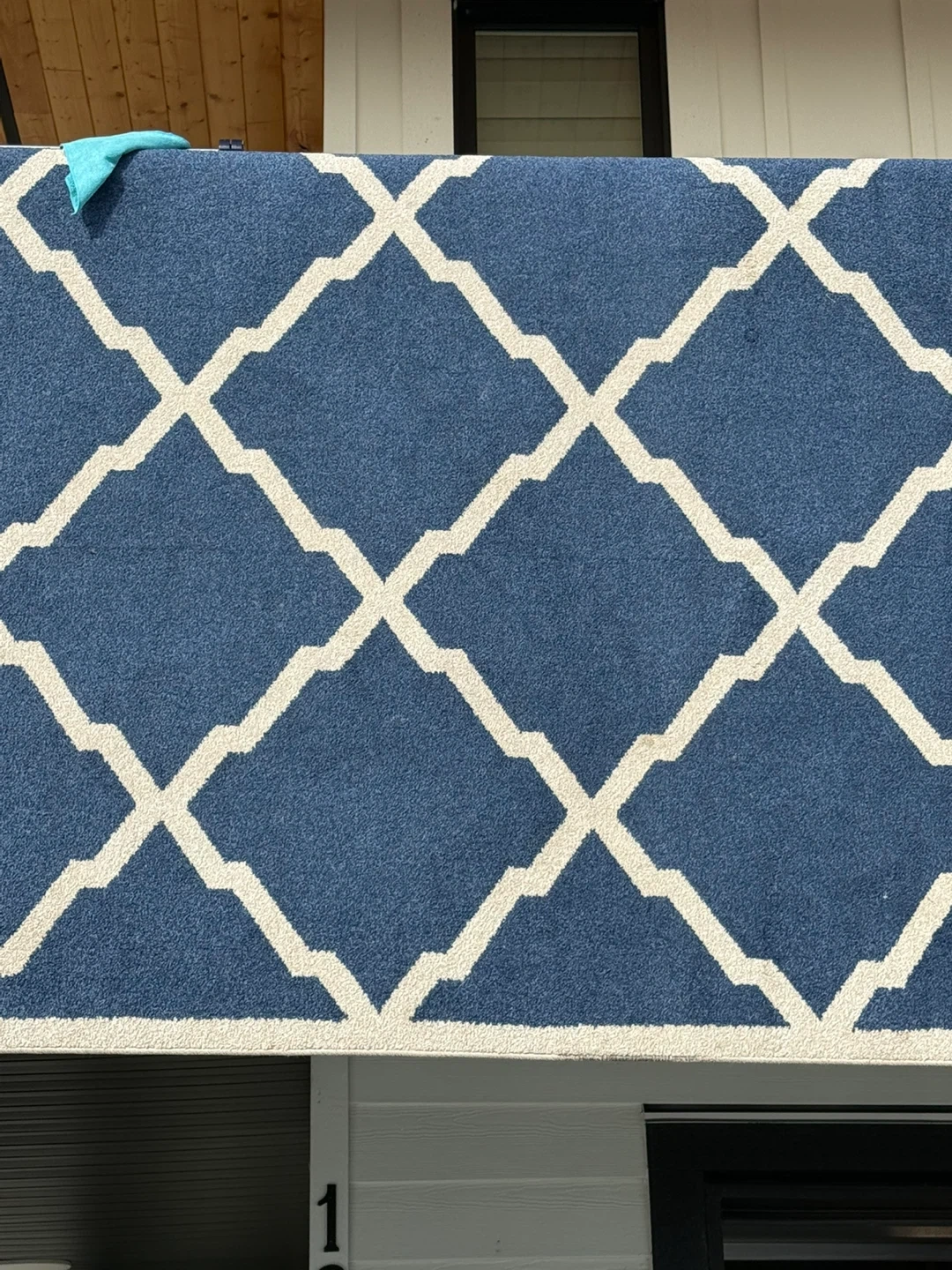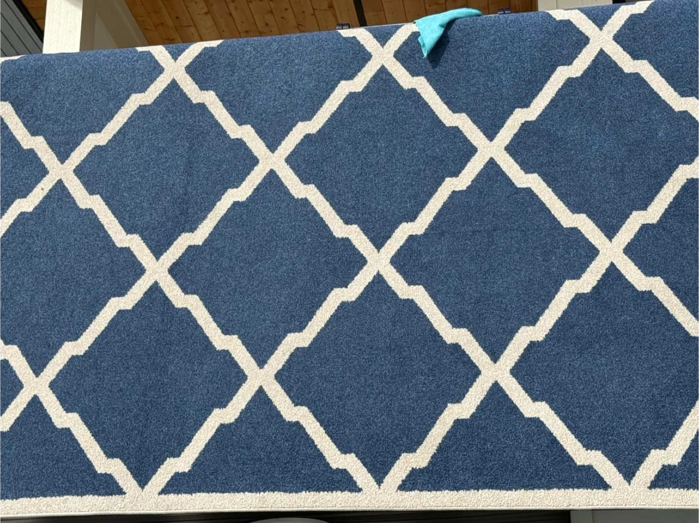 Selling a lovely blue and white patterned rug! It's in great condition and would look fantastic in any room. The rug features a stylish geometric design that adds a touch of elegance to your space. Feel free to reach out if you're interested!