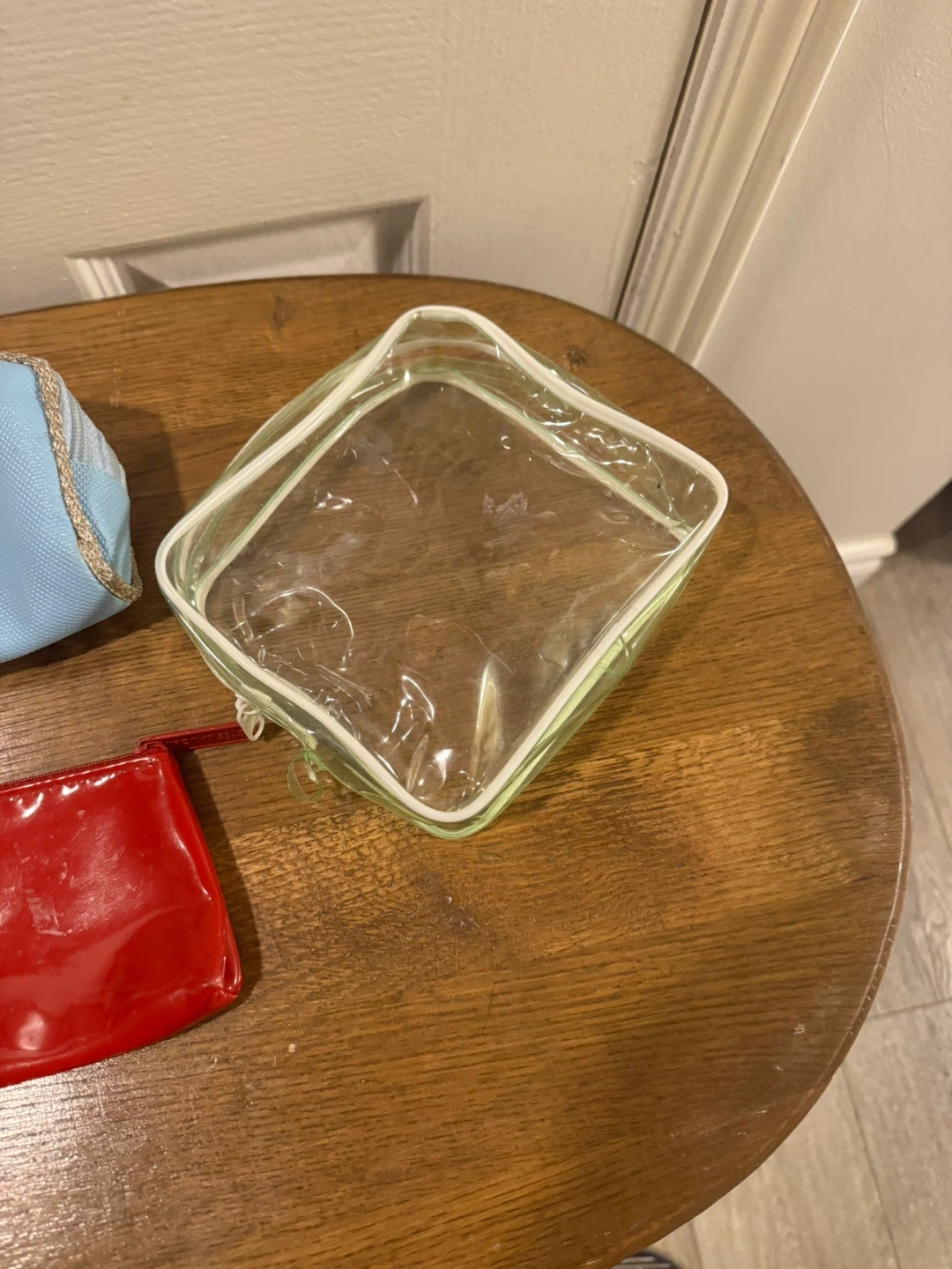 a set of three makeup bags. One is blue with a gold zipper and trim, and a 'Seraj' label. Another is red and shiny. The third is clear with a light green trim
