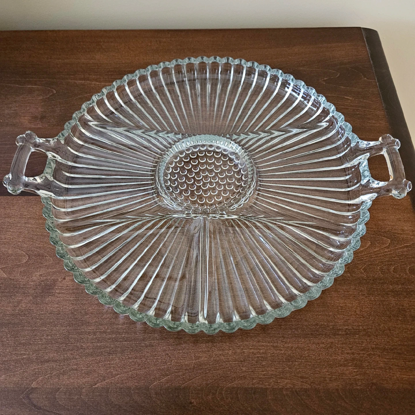 Selling a beautiful vintage clear glass serving platter! It features a 6-section divided design with a central circular section with hobnail pattern and outer radial ribbed pattern on underside. The platter has a lovely scalloped edge and handles on either side, making it easy to carry. 12.5" diameter, 15" handle to handle. style of National pattern from Jeannette Glass Co. one tiny chip on outside edge is pictured in 5th photo. Perfect for serving appetizers, snacks, or desserts at your next gathering.