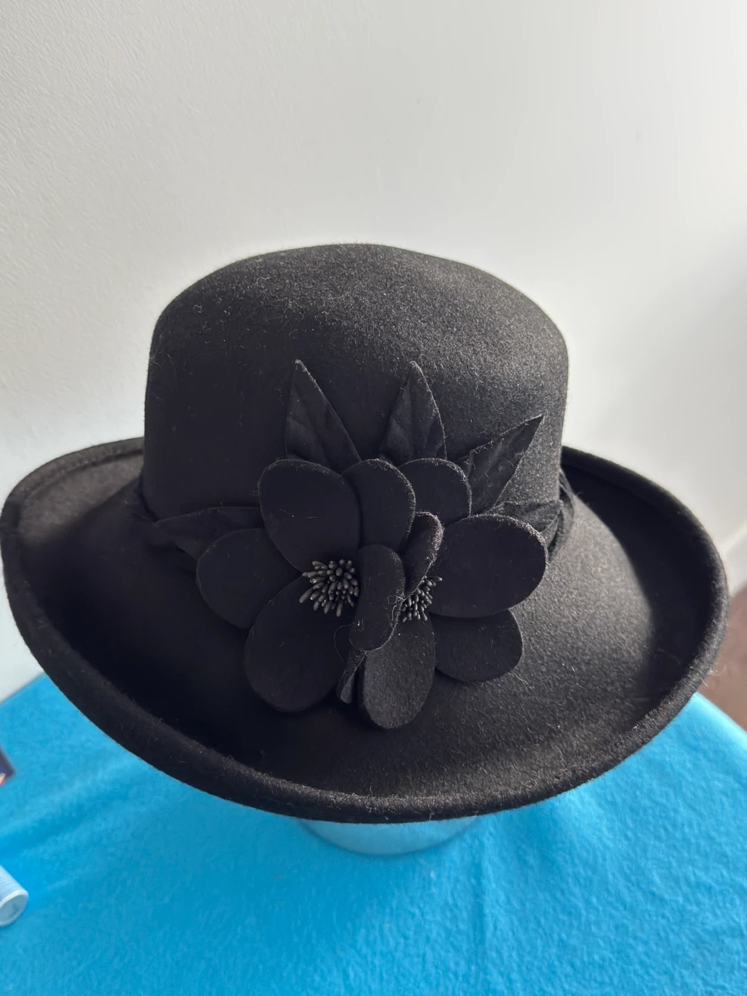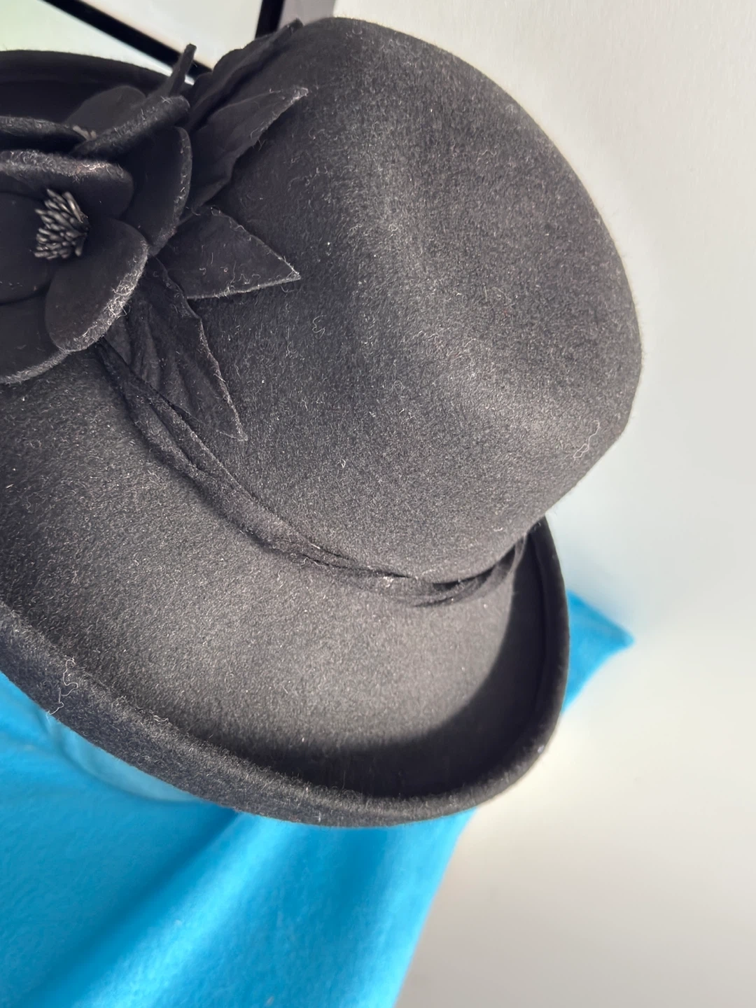 A stylish black wool hat perfect for adding a touch of elegance to any outfit! The hat features a lovely flower detail and is made of wool, making it warm and comfortable for cooler weather