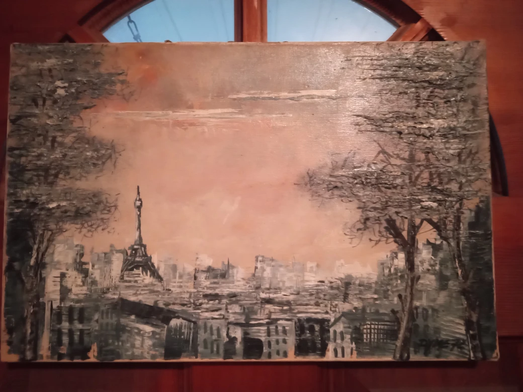 Here's a painting featuring the Eiffel Tower. It has a unique style and could be a great addition to your home decor. It's ready to find a new home!