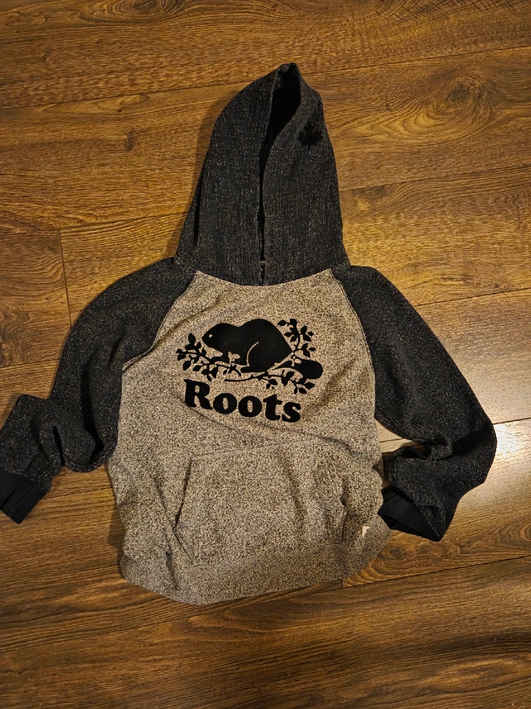 Roots Kids hoodie in size XL (11-12 years). It features a classic Roots beaver logo on the front. Great for keeping your little one warm and stylish!