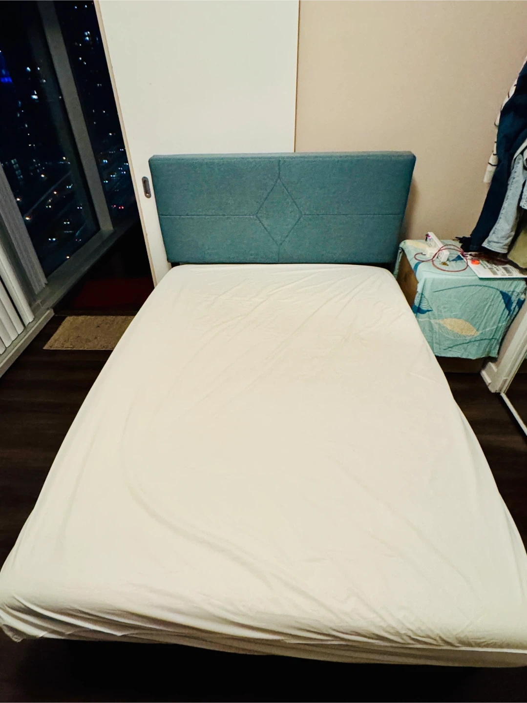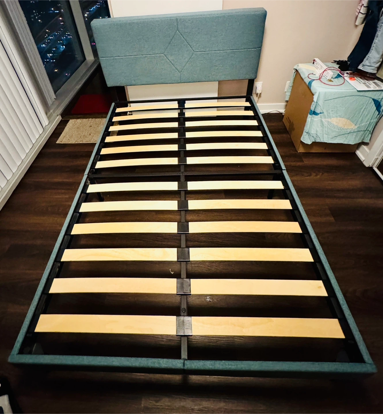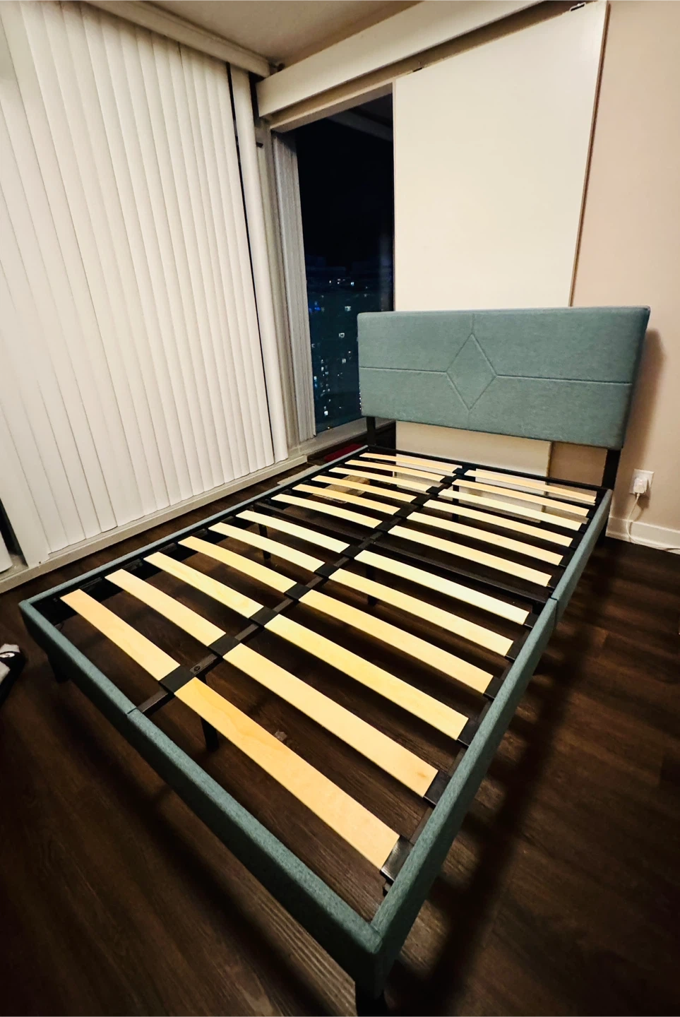 Selling a bed frame with a molblly green upholstered headboard. It's in great condition and ready for a new home! Message me if you're interested or have any questions
