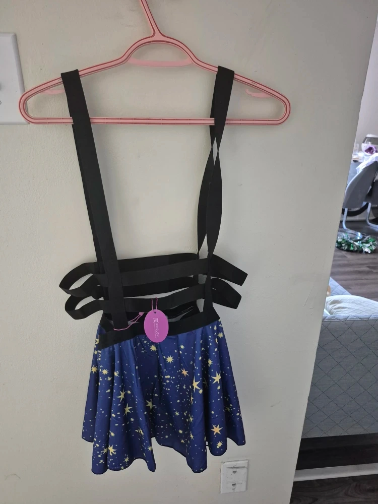 Selling an Avidlove suspender skirt with a cute star pattern! The skirt is blue with yellow stars and has black suspender straps. It's in great condition and ready for a new home