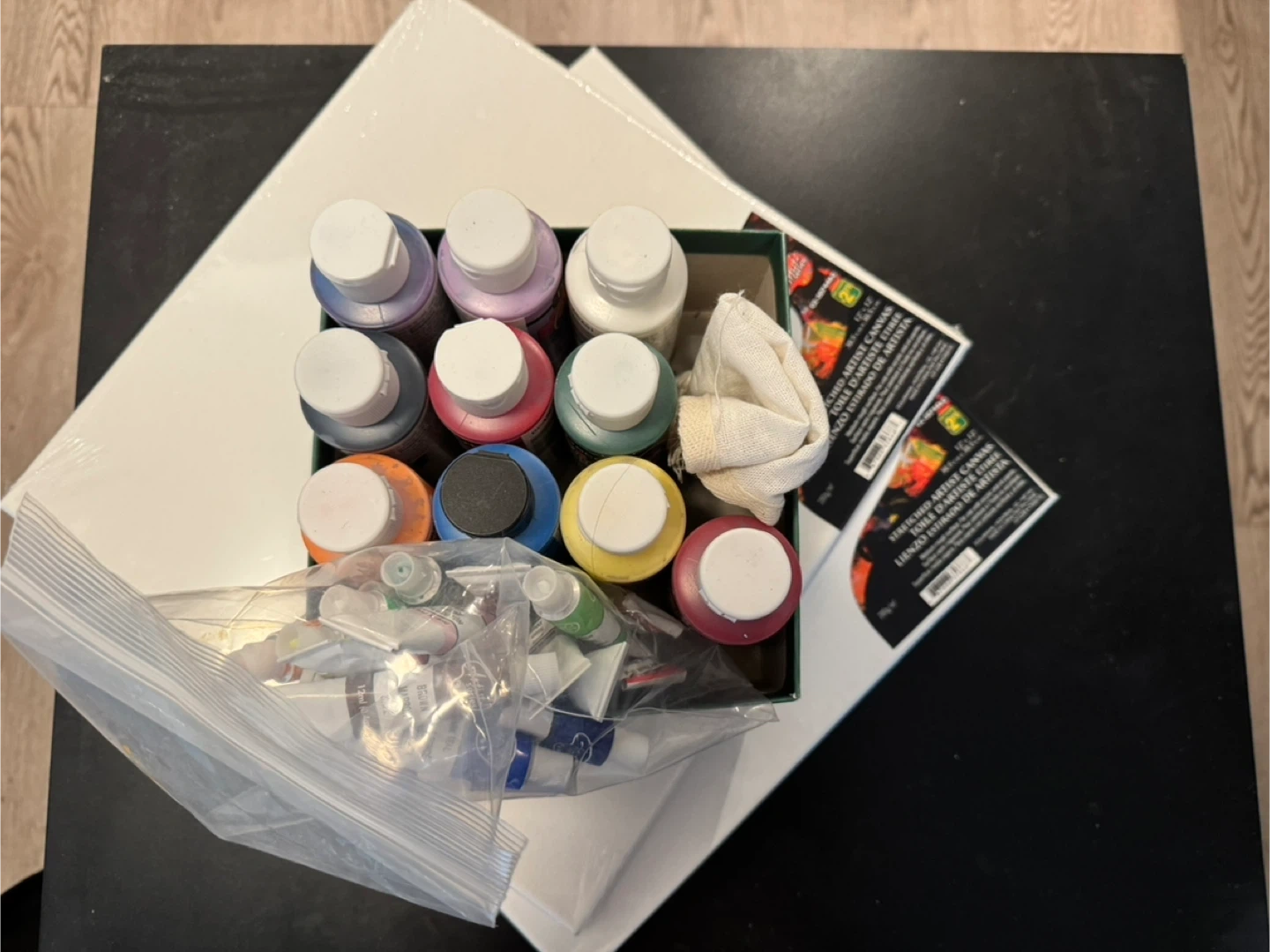 Selling a collection of art supplies including acrylic paints, and canvases. Perfect for anyone looking to start painting or replenish their art supplies!