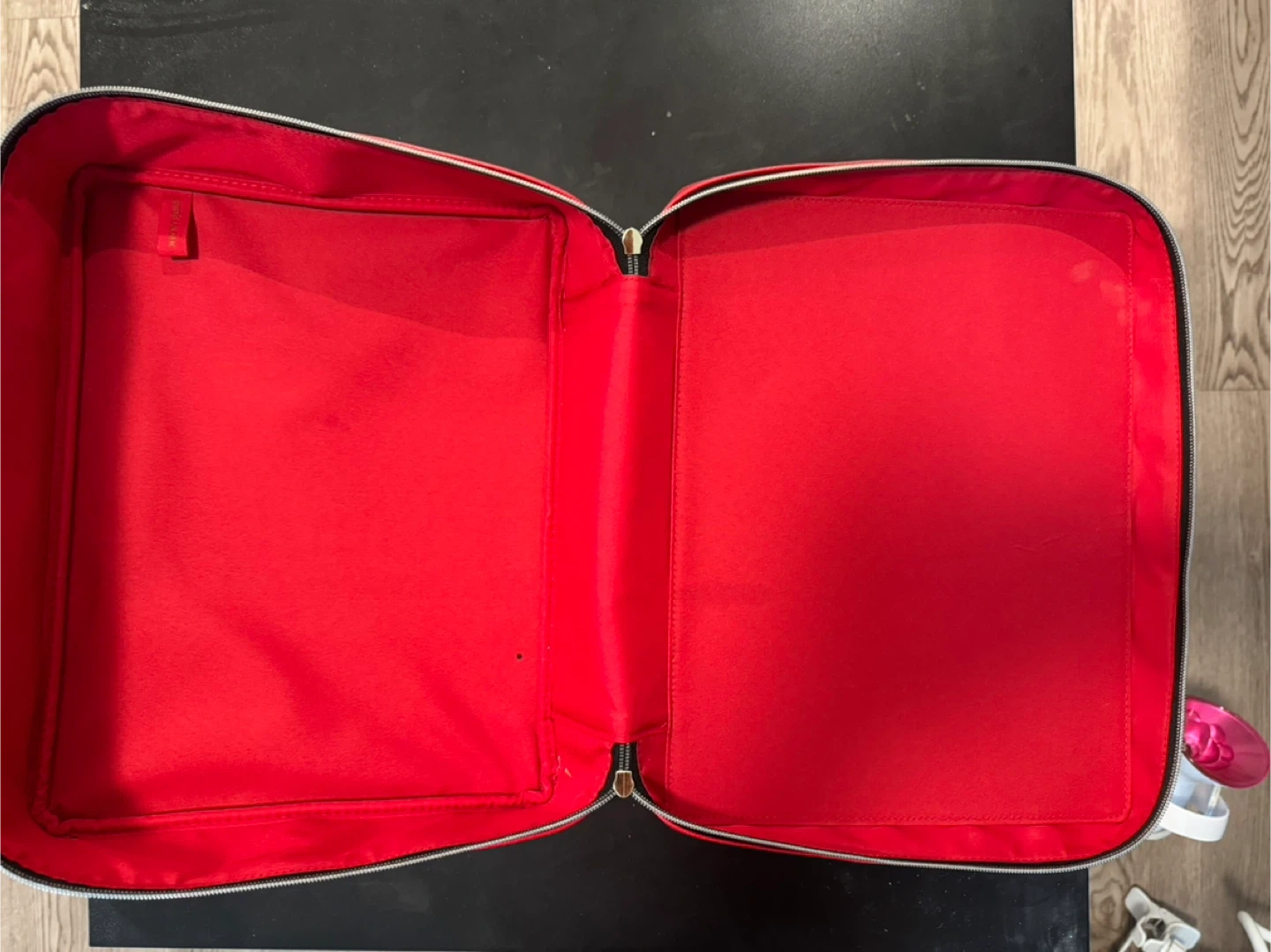 This is a cosmetic bag in red. It features a card suit design on the front. It's perfect for storing your makeup and other small items!